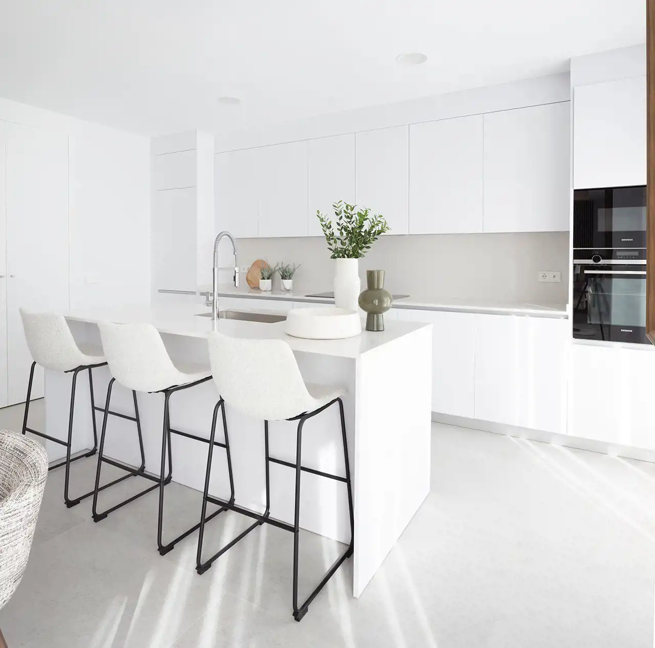 • Kuchnie z blatami z kwarcu, pełnym AGD w zabudowie i oświetleniem LED