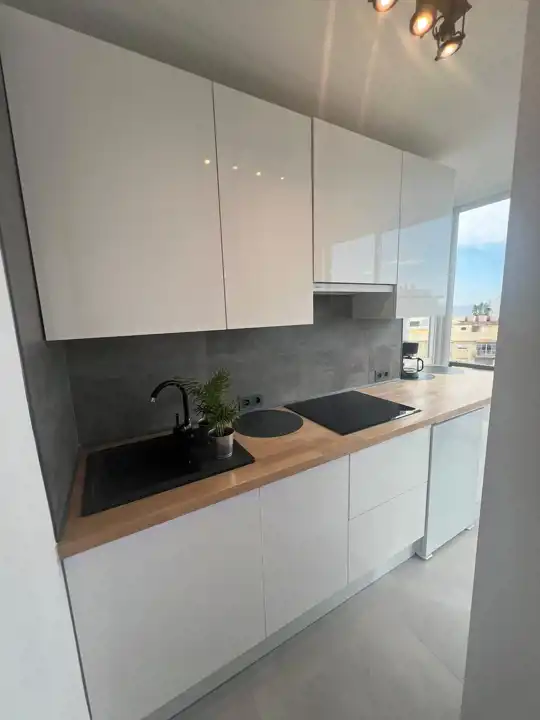 nowoczesną kuchnię lakierowaną z blatem z prawdziwego drewna dębowego, skórzaną rozkładaną sofę, telewizor, 2x szafę wnękową z drzwiami przesuwnymi, nowe okna panoramiczne, wszystkie nowe drzwi. Urbanizacja z 3 basenami, ogrodem, restauracją i parkingiem osiedlowym. Budynek z kilkoma windami. Kilka kroków od wszystkich niezbędnych usług i sklepów. Istnieje możliwość obejrzenia w dowolnym momencie.