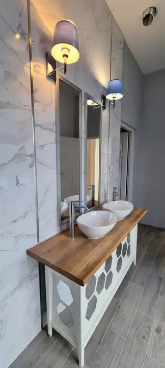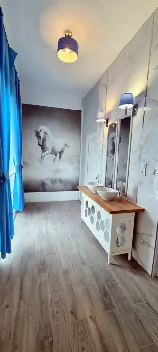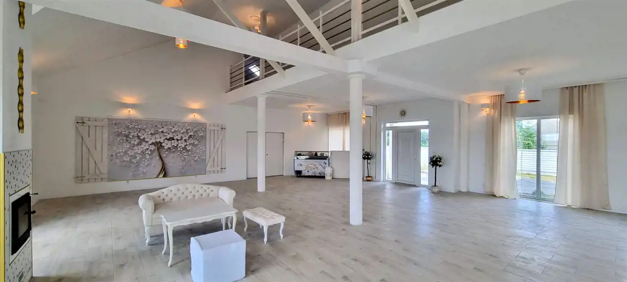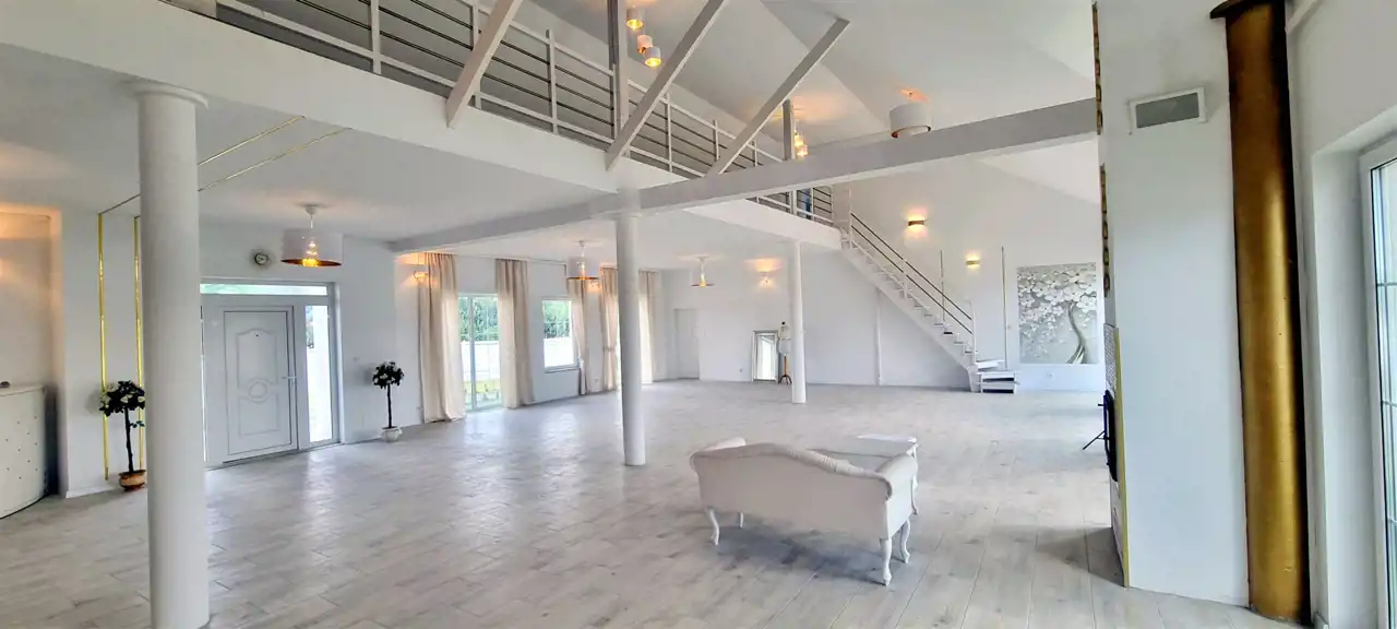 Składa się z 2 kondygnacji na parterze: z reprezentacyjnej i bardzo dużej sali bankietowej, kuchni wraz z pom. gospodarczymi i technicznym. Efektownych, pięknie zaaranżowanych i obszernych 2 WC (damska – męska) oraz wyjścia na taras i do sporego ogrodu. Ponadto na parterze znajduje się (z osobnym wejściem) apartament w łazienką i WC. Drugi poziom to wspaniała antresola, na której - po obu stronach - są osobne dwa kameralne apartamenty z łazienkami i WC.