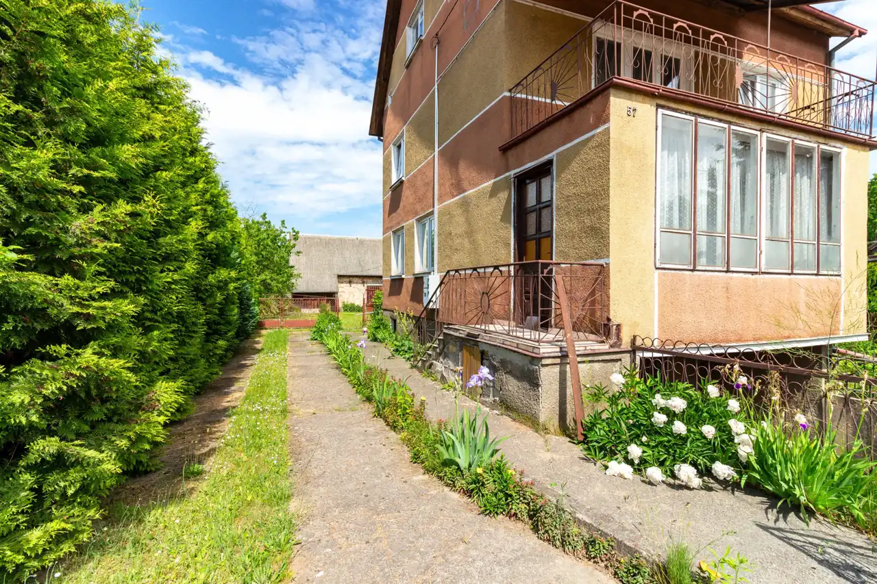- piwnica: garaż (ok. 23m2) z pomieszczeniem gospodarczym, kotłownia, kuchnia z piecem kaflowym: