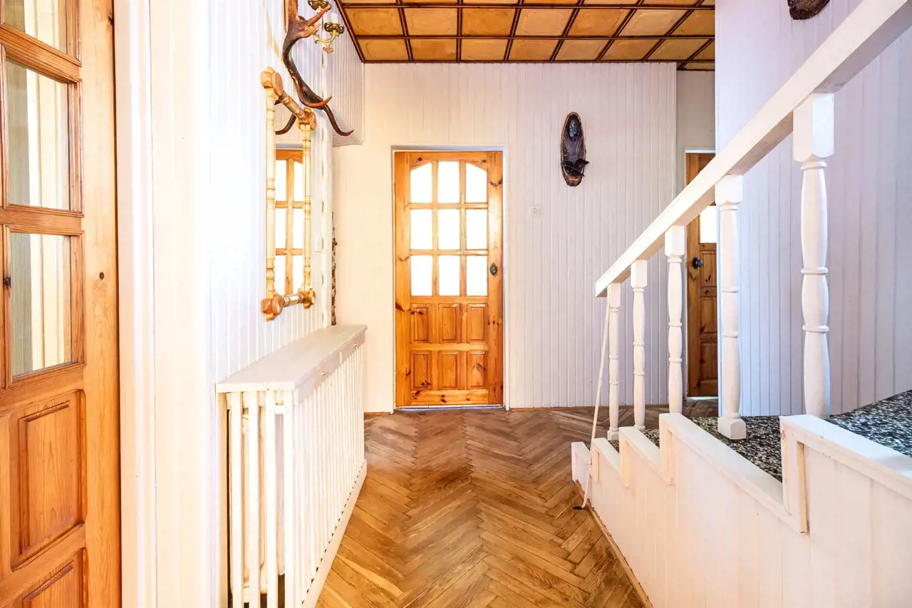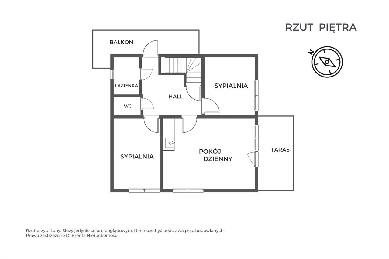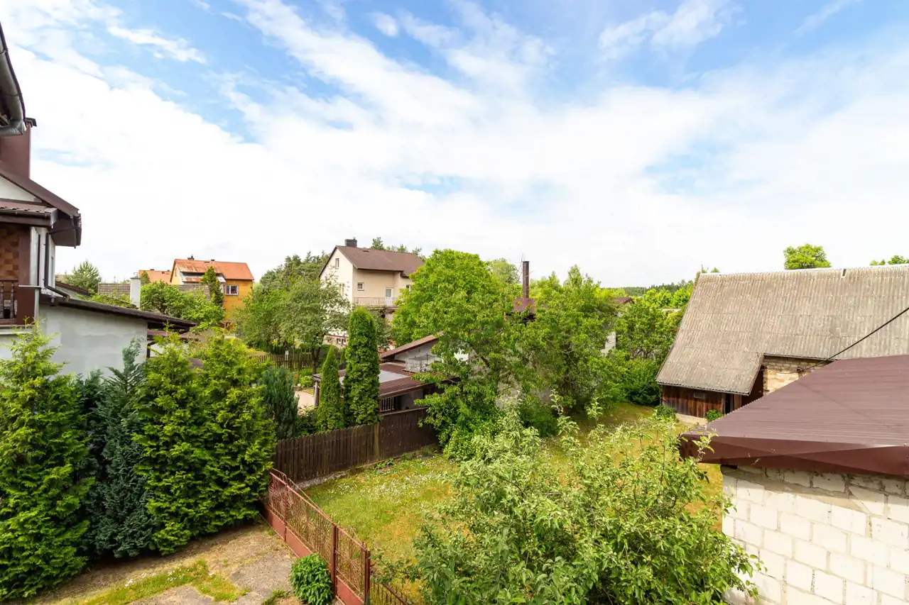 - piętro: dwie sypialnie (po ok. 9m2), pokój dzienny (20m2) z kominkiem i wyjściem na taras, łazienka, odrębne wc oraz hall z wyjściem na balkon;