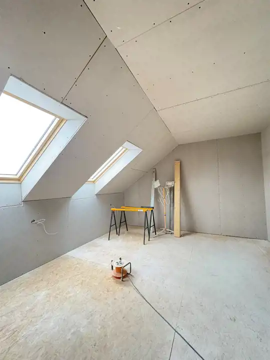 Dom realizowany na bazie projektu D-186 z pracowni Extradom.pl, przy czym w trakcie budowy wprowadzono zmiany zwiększające funkcjonalność i komfort użytkowania. Na poddaszu podniesiono ścianę kolankową do wysokości ok. 135 cm, co znacząco powiększa przestrzeń użytkową i ułatwia aranżację pomieszczeń.
