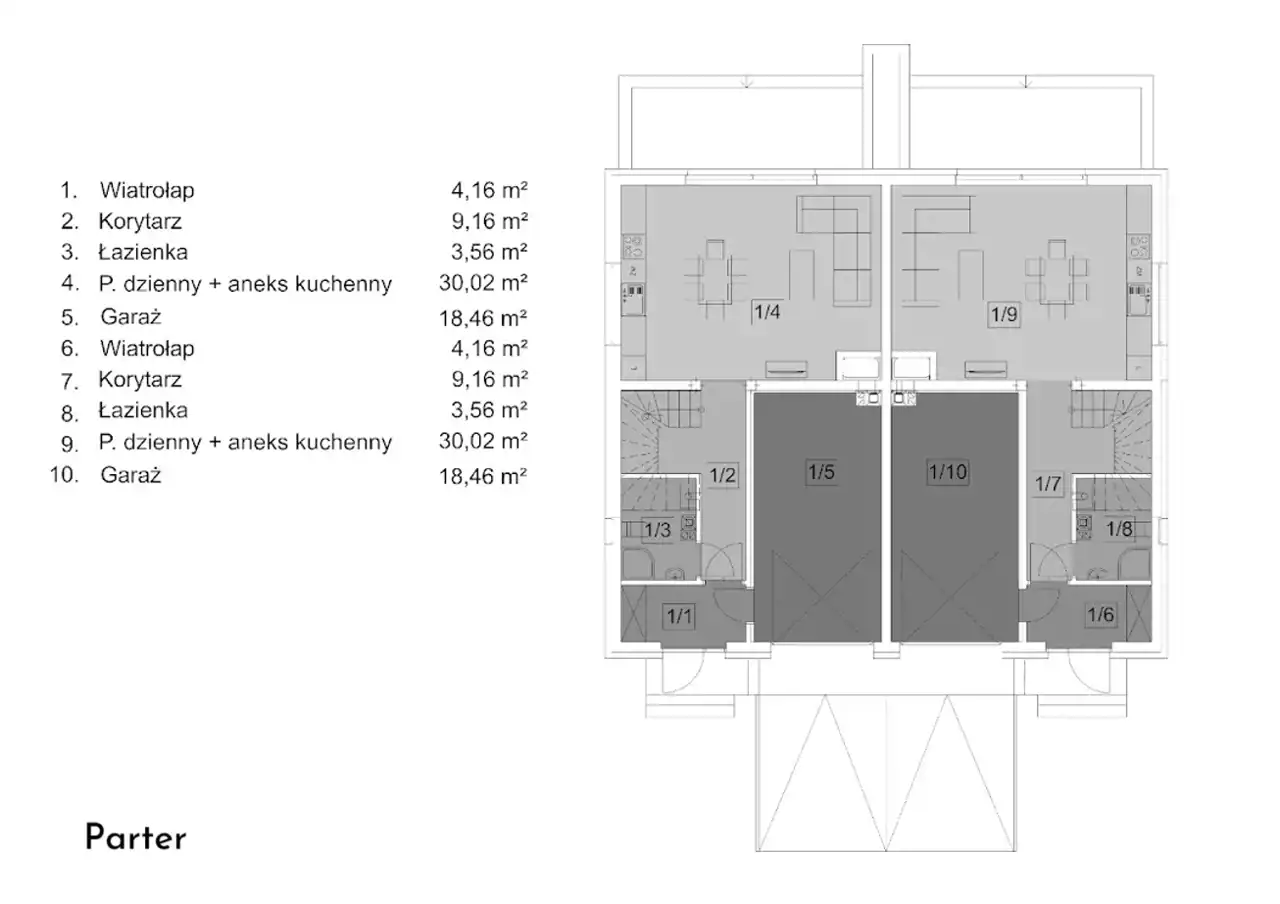 Dwa lokale mieszkalne w bliźniaku, położone na działce o pow. 772 m², powierzchnia jednego lokalu 112,7m², z udziałem w gruncie około 385 m²