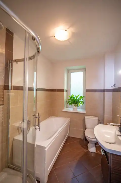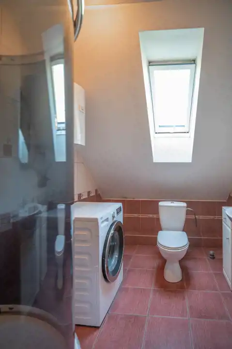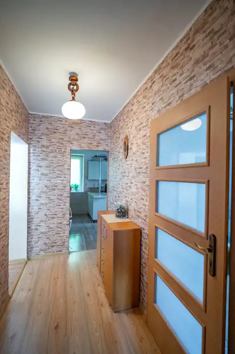 Okna PCV oraz częściowo drewniane. Wnętrza wykończone gładziami gipsowymi, tapetami, na podłogach panele i terakota.