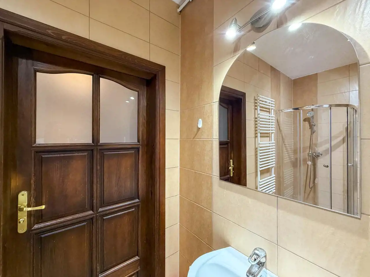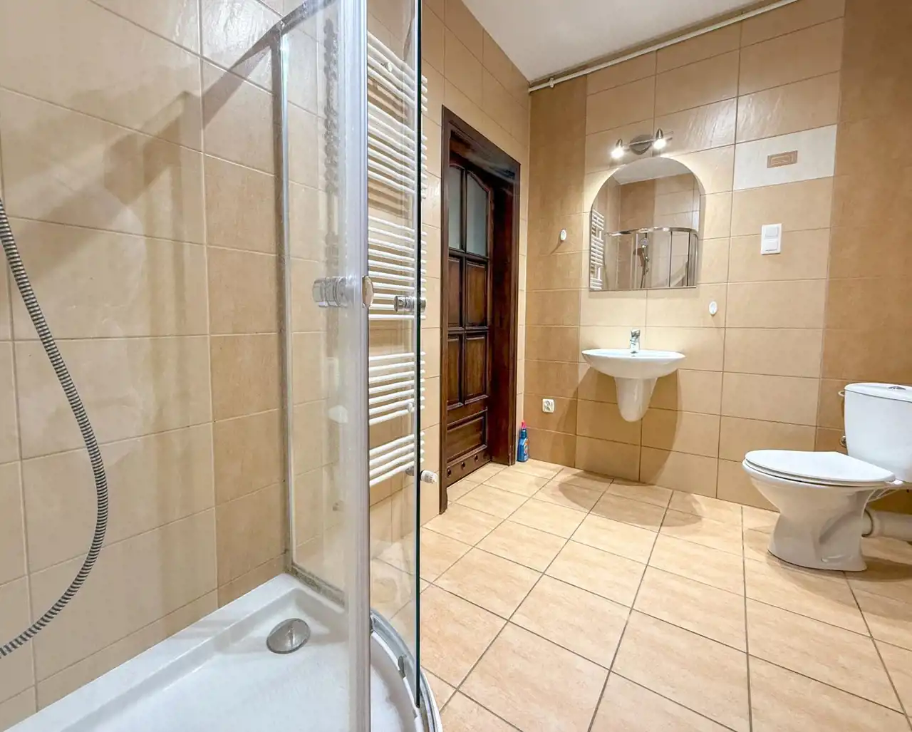 - Łazienka: 5,70 m² – nowoczesna, wykończona w jasnych płytkach, wyposażona w prysznic.