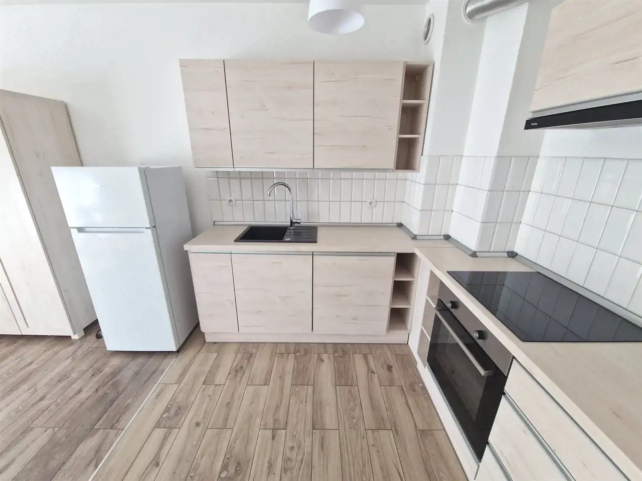 Mieszkanie w jasnych kolorach, z nową zabudową kuchenną.