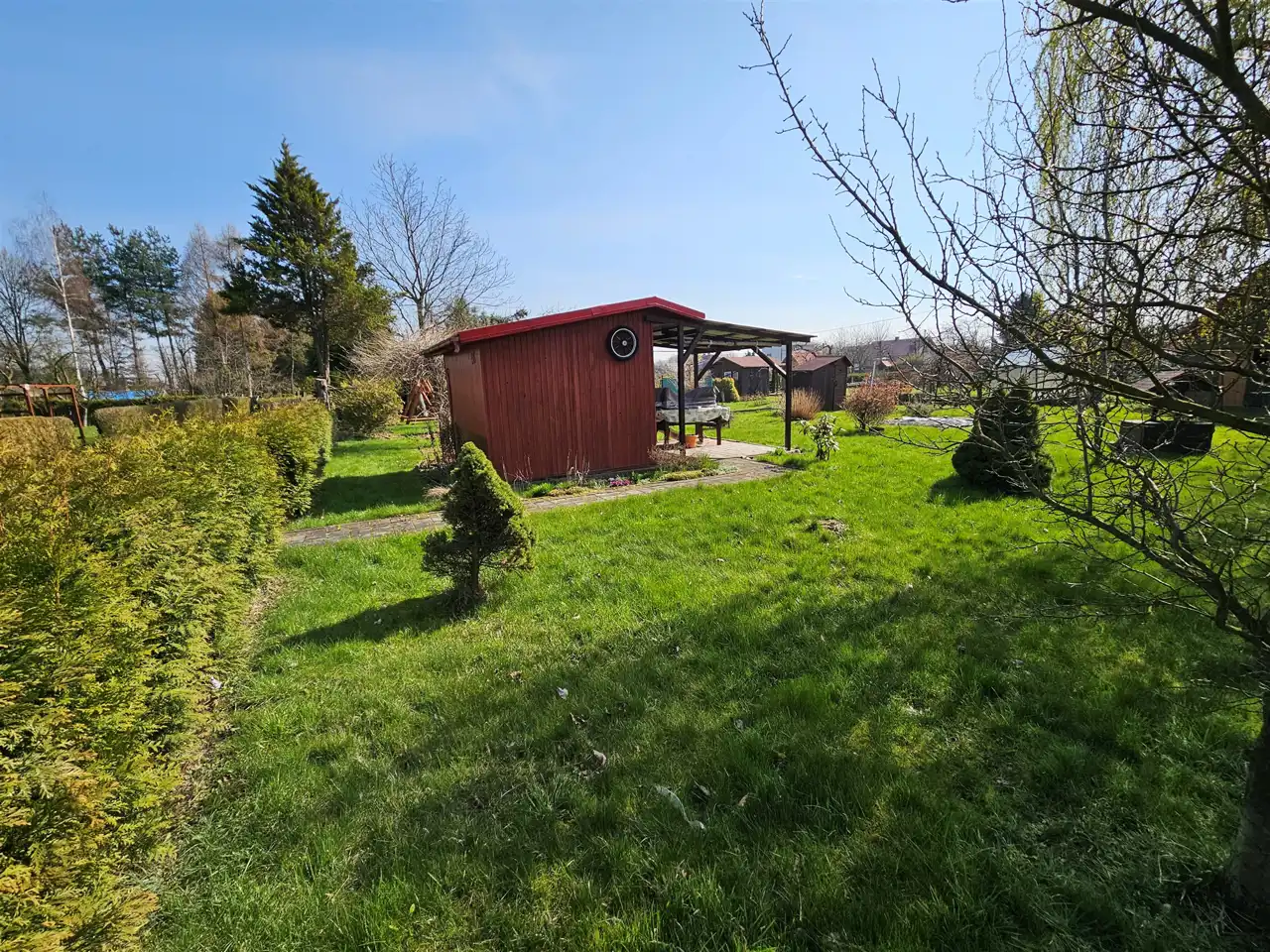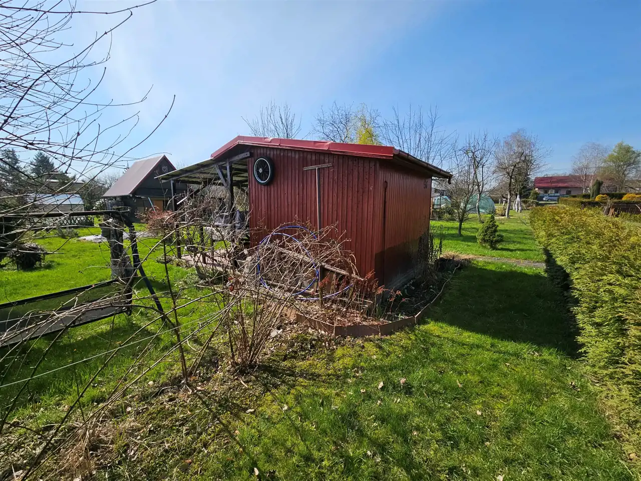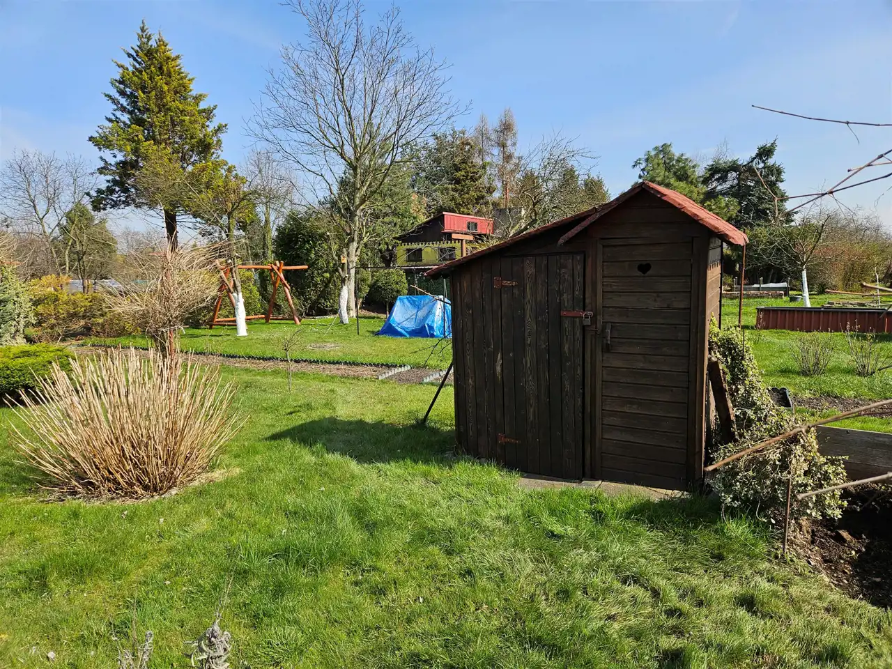 Na działce znajduje się domek narzędziowy miejsce na przechowywanie różnego typu rzeczy, a obok niego znajdziesz toaletę.