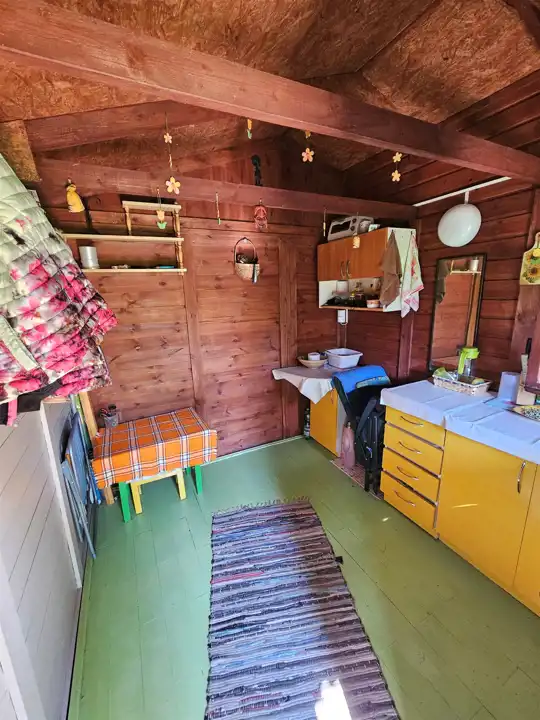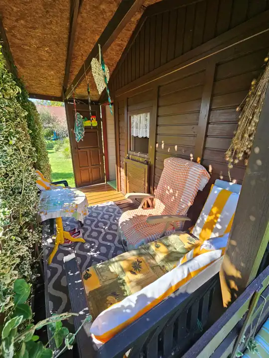 Przed wejściem do altanki część małego tarasu z zadaszeniem gdzie podczas mniej korzystnej pogody możesz wypoczywać. W altance znajduje się pokój który można zaaranżować według własnego gustu oraz potrzeb.
