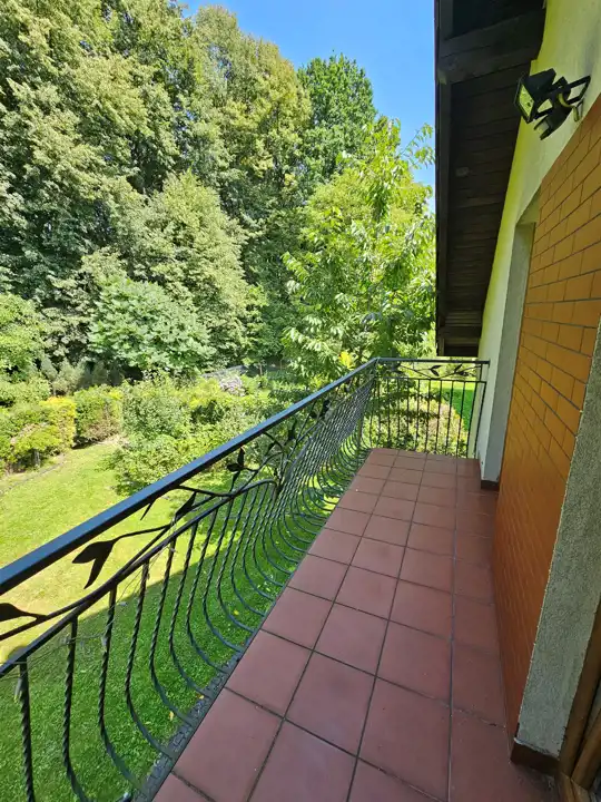 Wyjście z dwóch sypialni na balkon z widokiem na ogród i las.