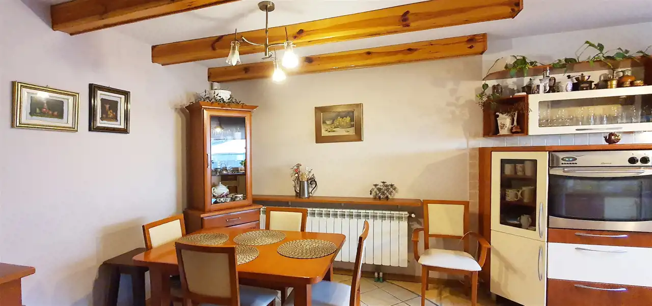 Dom jest ogrzewany nowoczesnym piecem dwufunkcyjnym gazowym, a w salonie znajduje się stylowy kominek dodający uroku i ciepła. Na uwagę zasługuje również nowa instalacja fotowoltaiczna, która zapewnia oszczędności i ekologiczne rozwiązania.