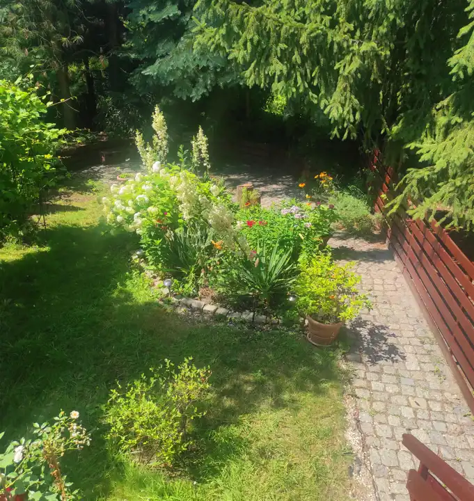 Przestronny salon z kominkiem, który jest sercem domu i miejscem relaksu. Z salonu można wyjść na duży, słoneczny taras, prowadzący do pięknie zagospodarowanego ogrodu – idealnego na odpoczynek w cieniu drzew.
