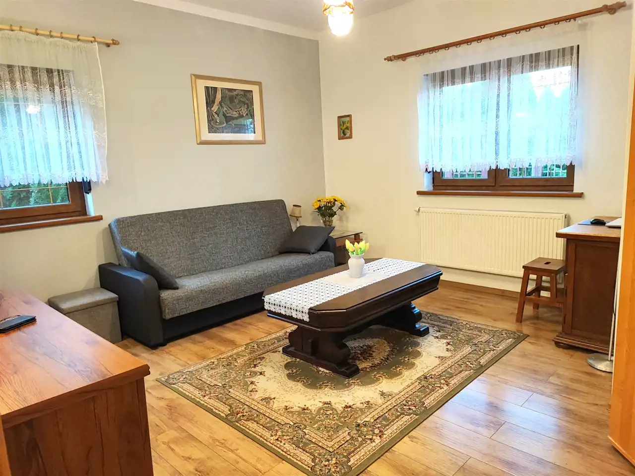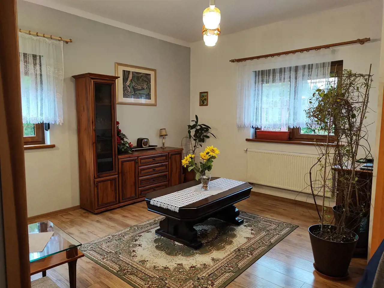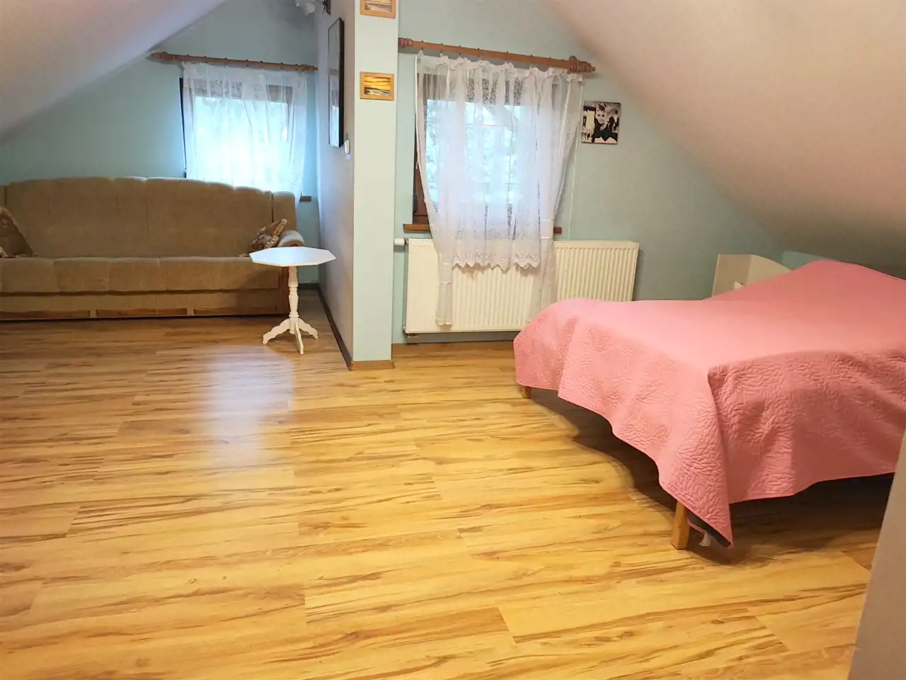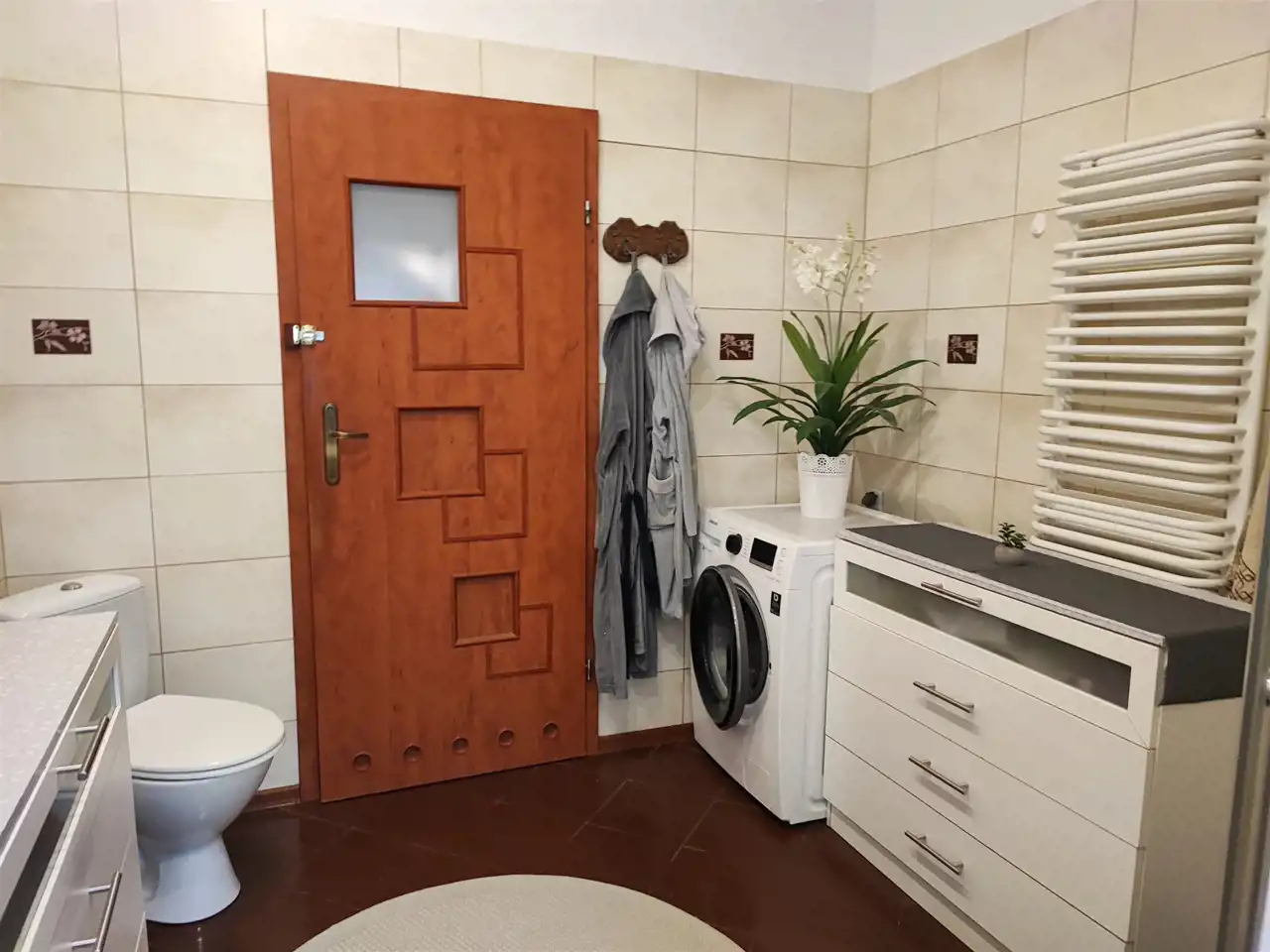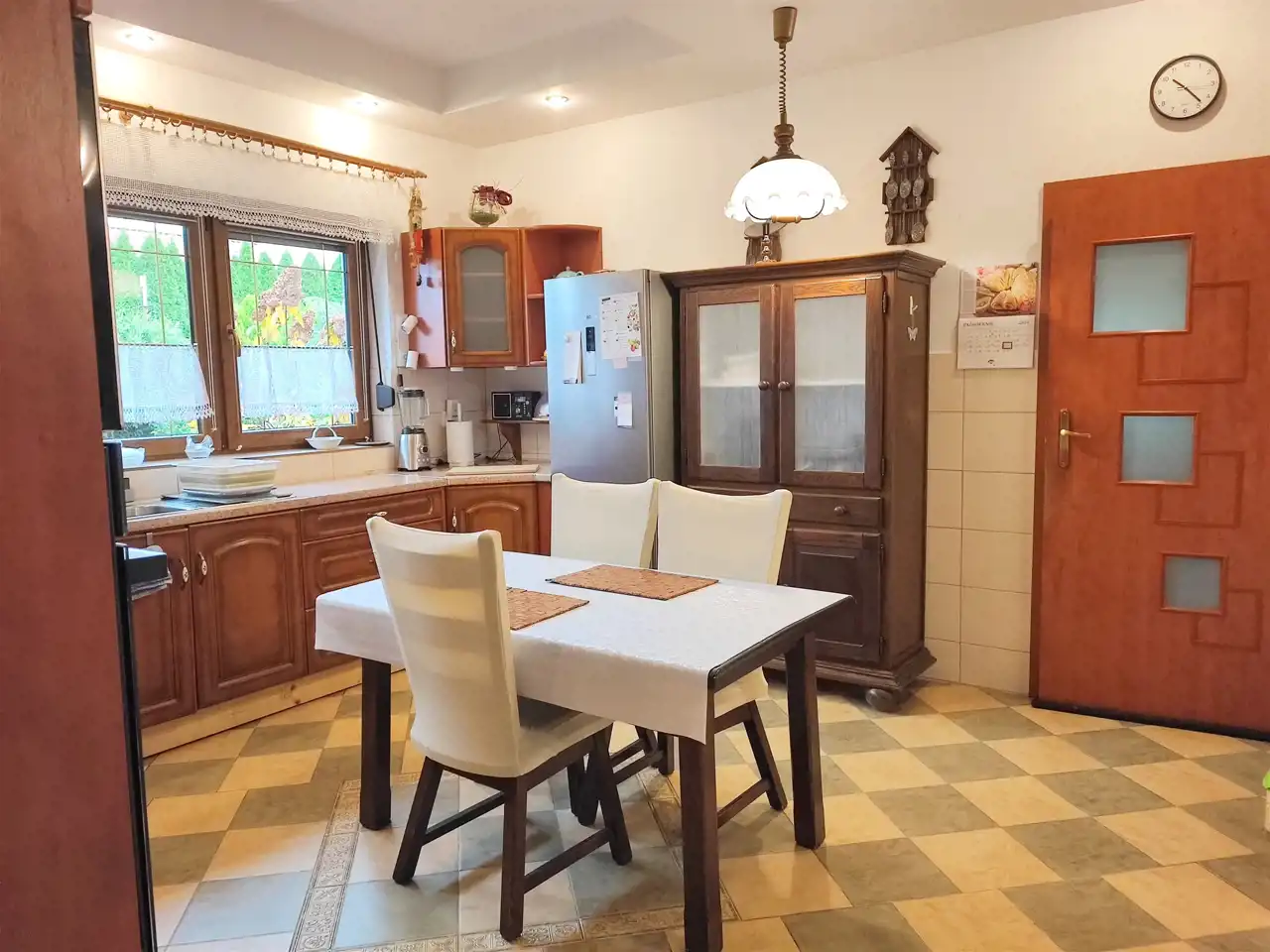 Dom ogrzewany jest piecem gazowym oraz kominkiem, co zapewnia wygodę i niskie koszty utrzymania przez cały rok.