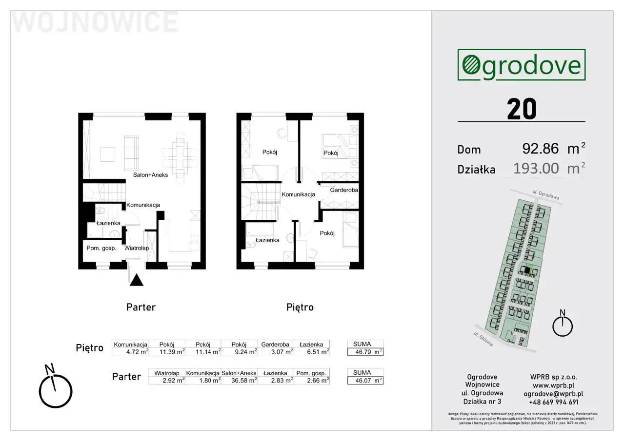 każdy z budynków ma powierzchnię użytkową 92,6 m2 , różnią się powierzchniami działek ( od 262m2 do ok 400m2 powierzchni działki ) oraz usytuowaniem względem stron świata .