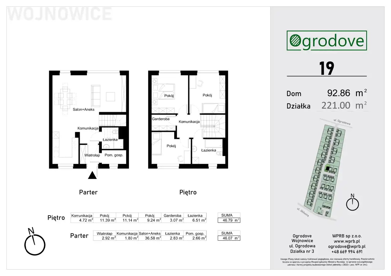 każdy z budynków ma powierzchnię użytkową 92,6 m2 , różnią się powierzchniami działek ( od 262m2 do ok 400m2 powierzchni działki ) oraz usytuowaniem względem stron świata .