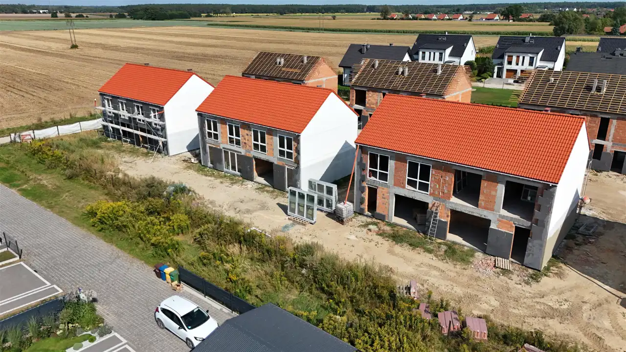 Obiekty doprowadzone będą do stanu deweloperskiego, z zewnątrz całkowicie wykończone, ocieplone, łącznie z podjazdami, elewacją zewnętrzną, stolarką ( okna, drzwi ) tył i boki ogrodzenie, wewnątrz wszystkie instalacje rozprowadzone .