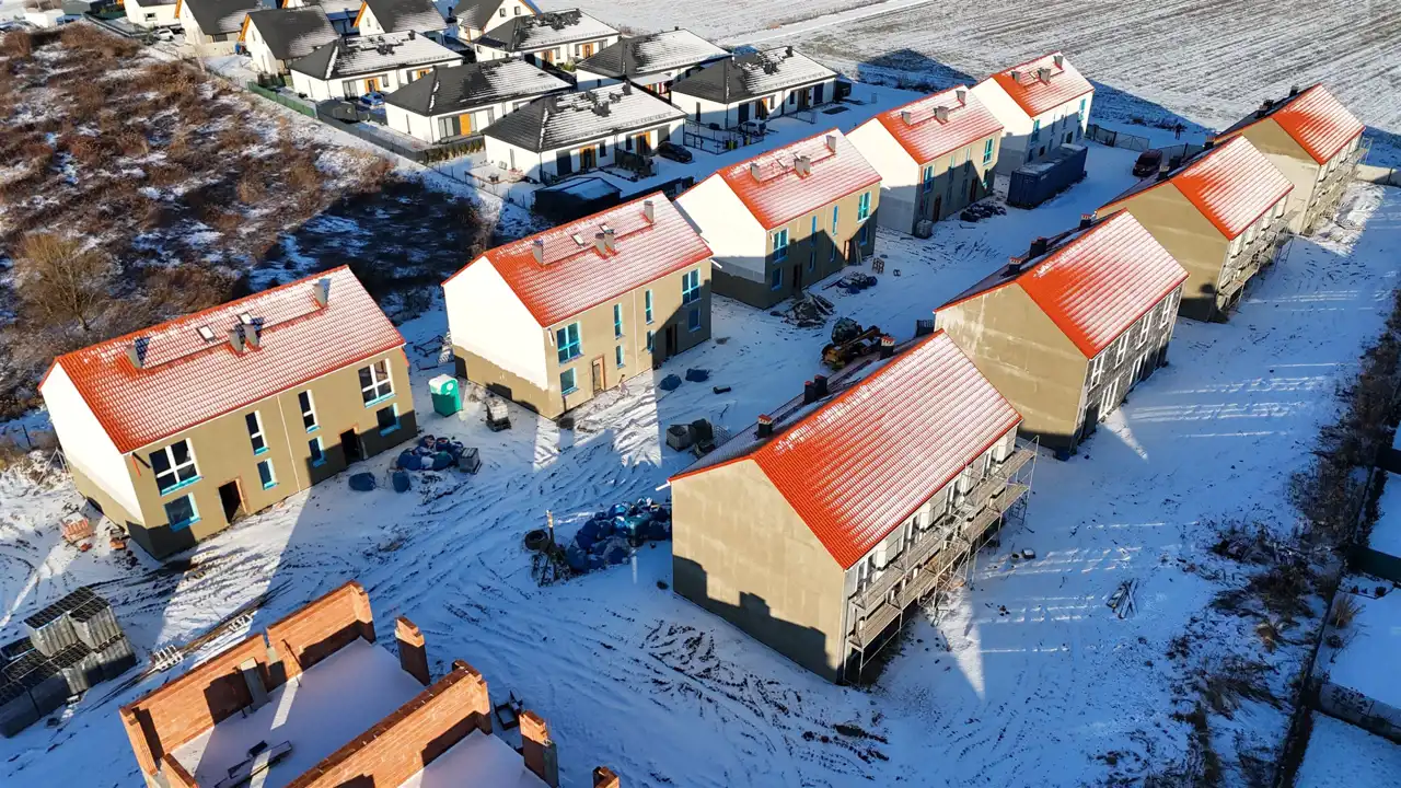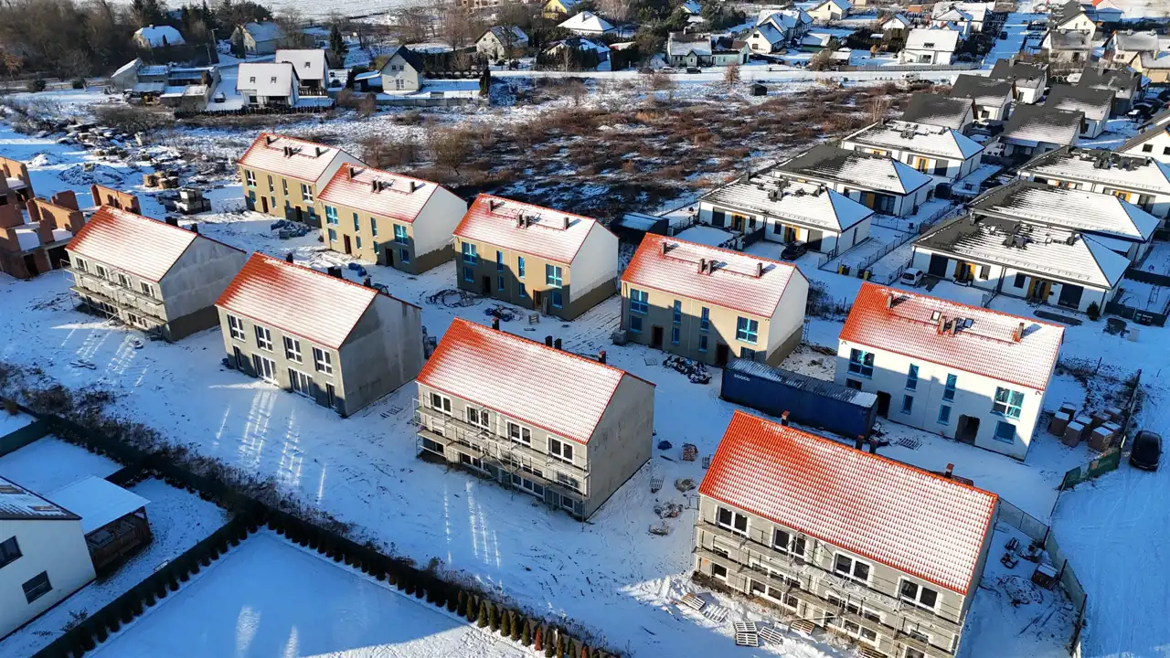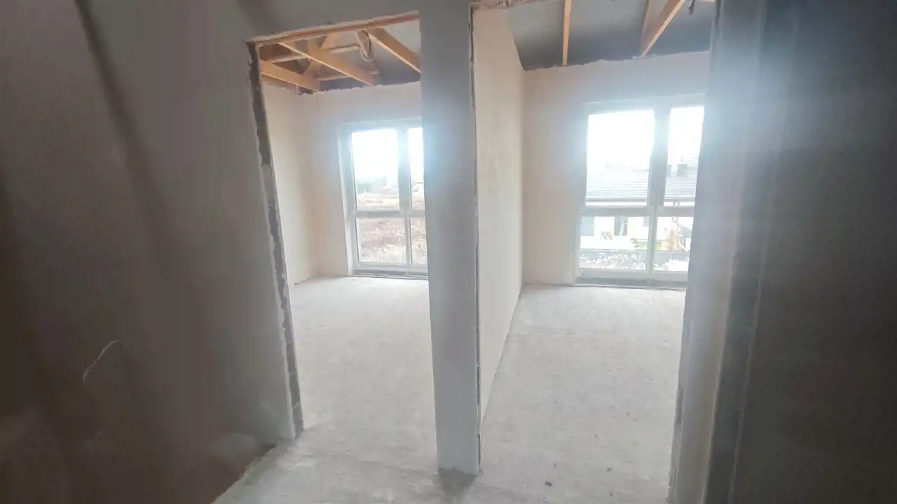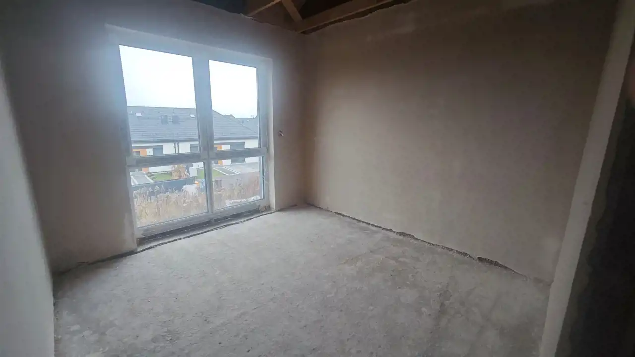 Stan deweloperski całkowite wykończenie z zewnątrz: budynki ocieplone ( grafit 18cm) z dwoma miejscami parkingowymi, elewacją zewnętrzną, stolarką ( okna trzy szybowe profil - salamanter, drzwi wejściowe) tył i boki ogrodzenie, wew. tynki maszynowe gipsowe, wszystkie instalacje, posadzki całość do indywidualnego wykończenia.