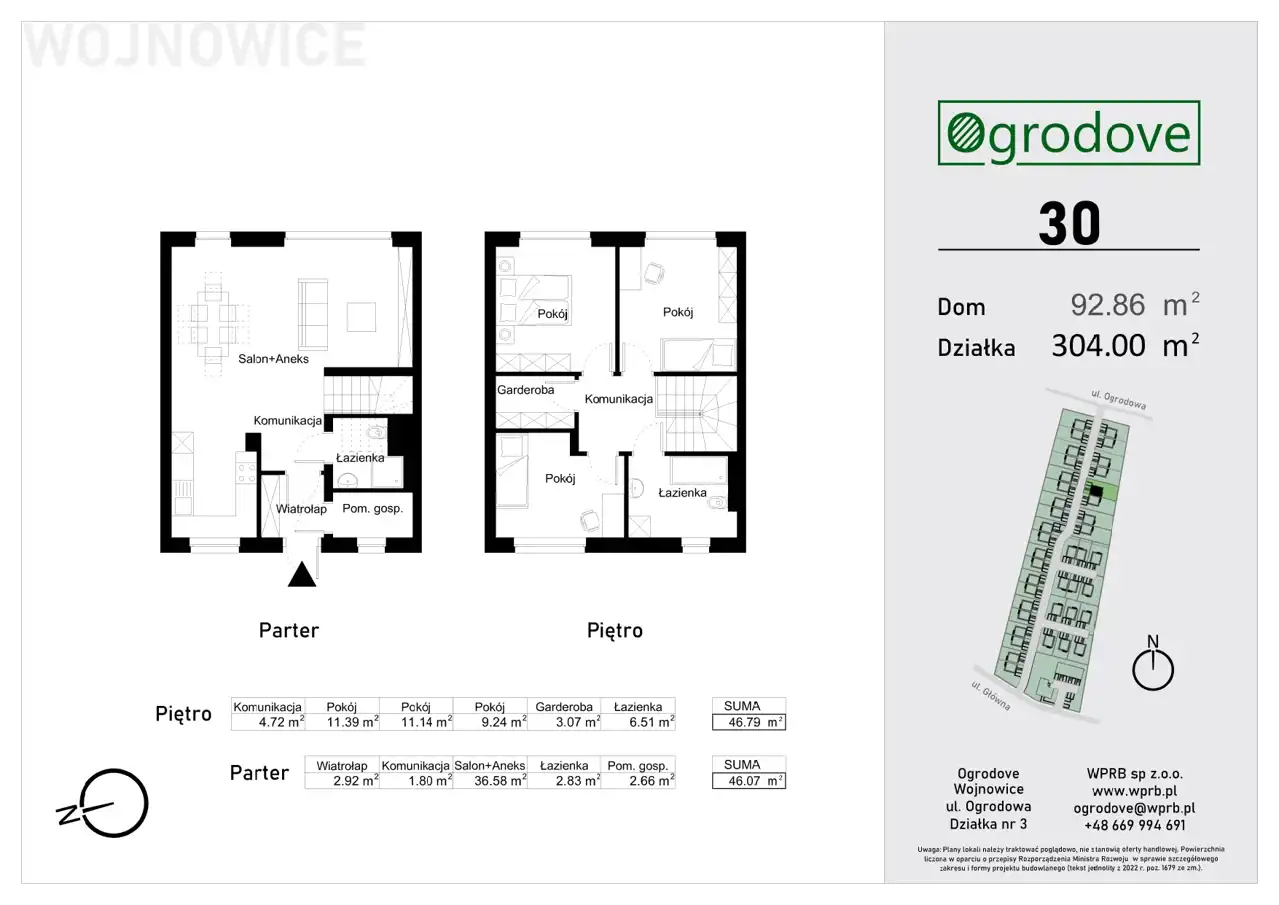 każdy z budynków ma powierzchnię użytkową 92,6 m2 , różnią się powierzchniami działek ( od 262m2 do ok 400m2 powierzchni działki ) oraz usytuowaniem względem stron świata .