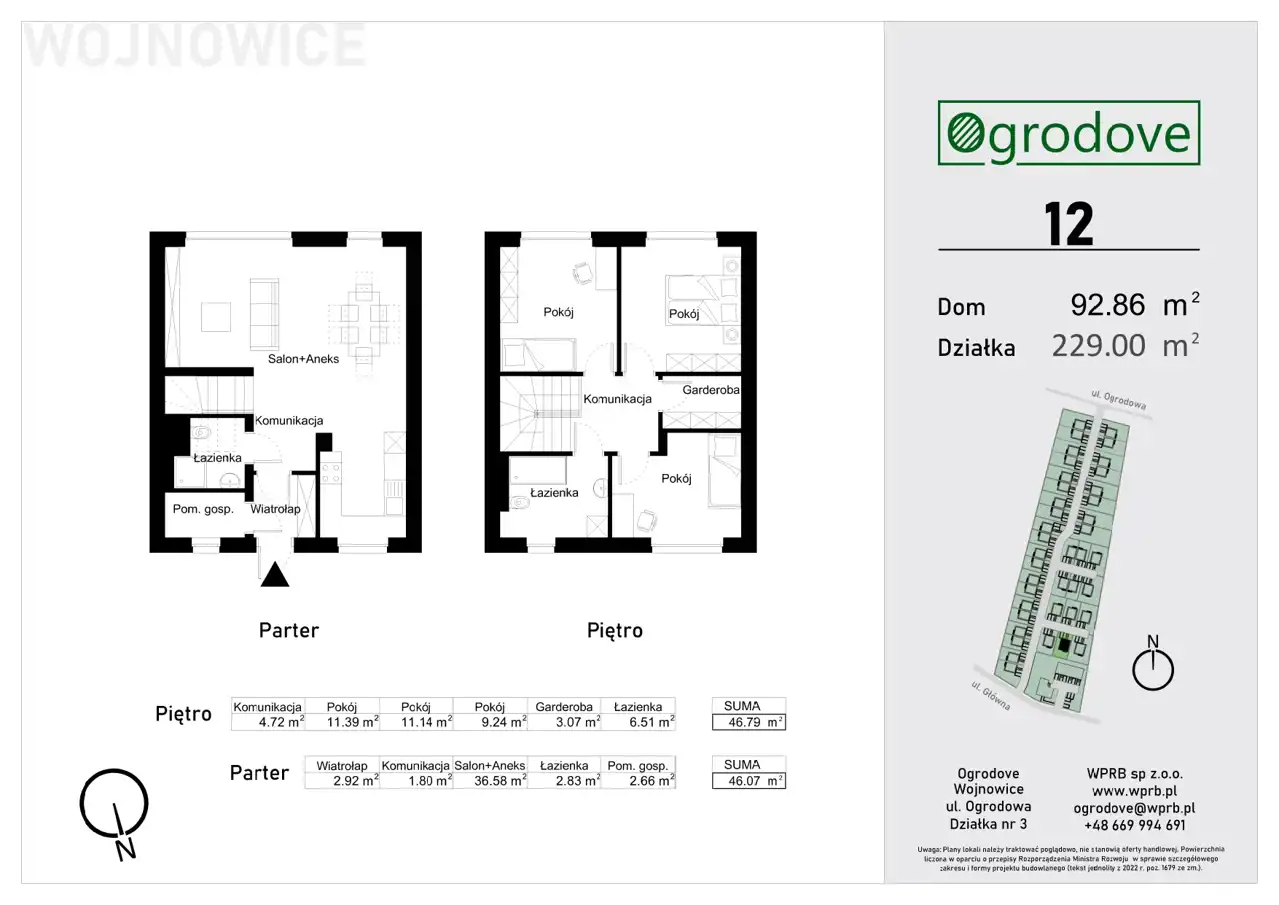 każdy z budynków ma powierzchnię użytkową 92,6 m2 , różnią się powierzchniami działek ( od 262m2 do ok 400m2 powierzchni działki ) oraz usytuowaniem względem stron świata .