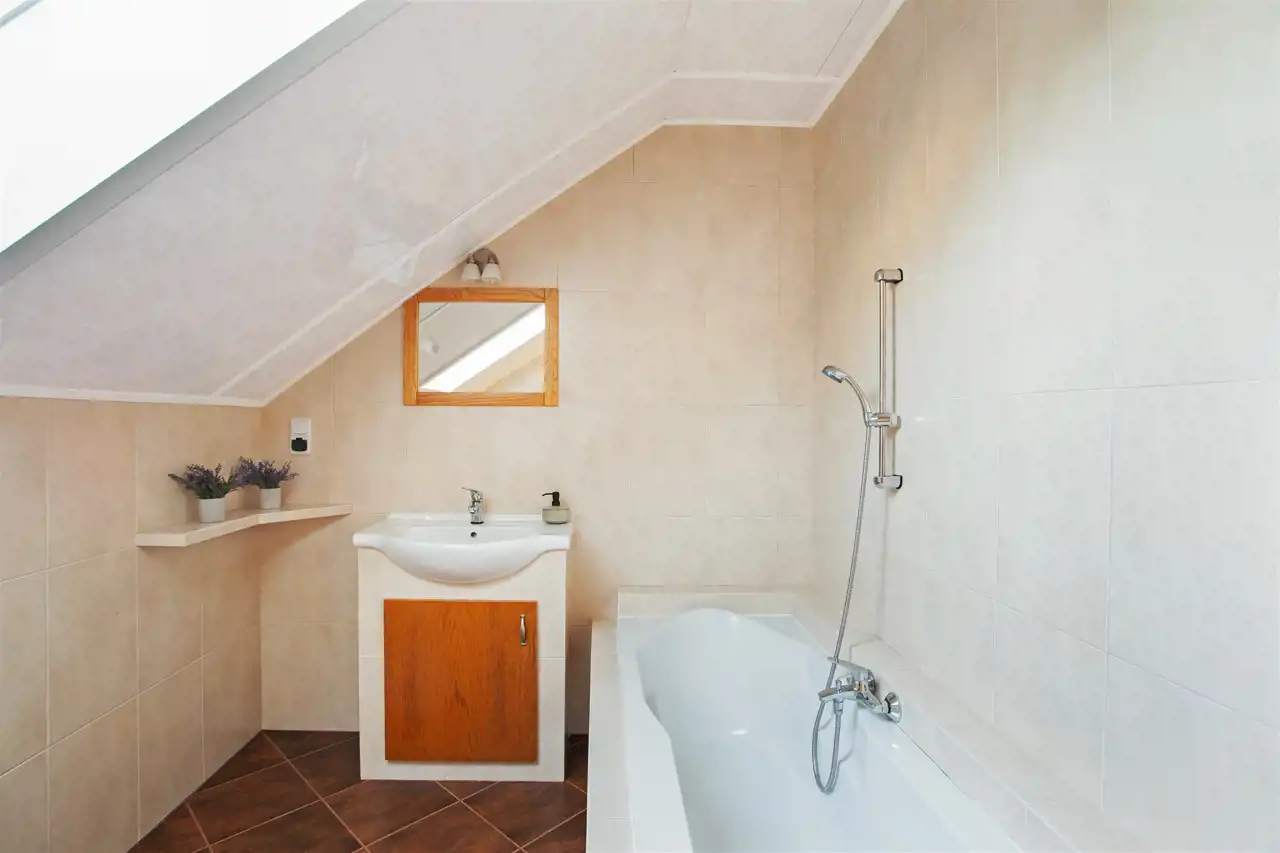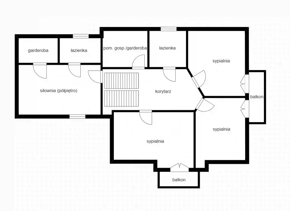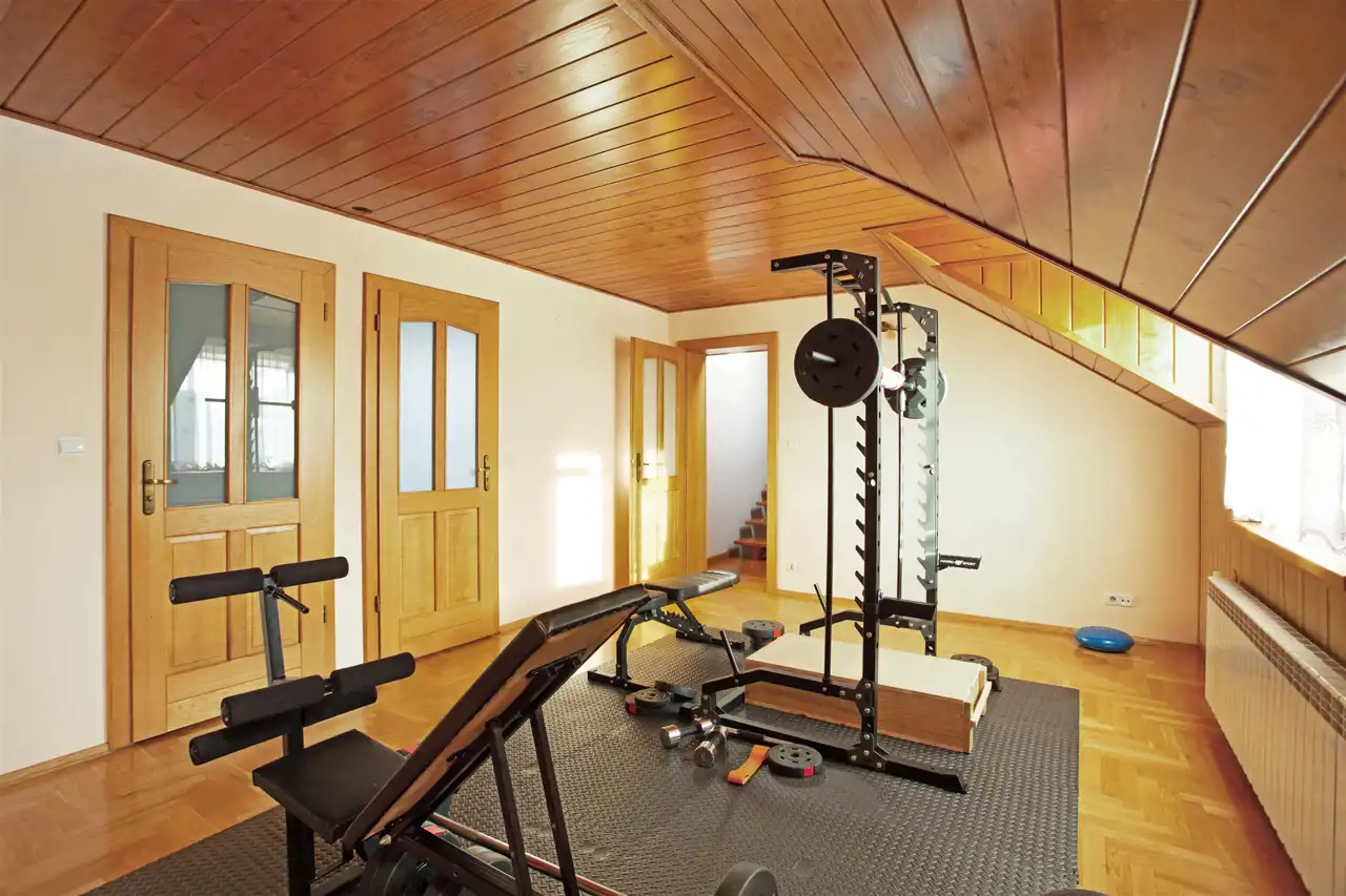 Na półpiętrze znajduje się siłownia (którą można przearanżować na pokój), a także łazienka z wanną i garderoba.