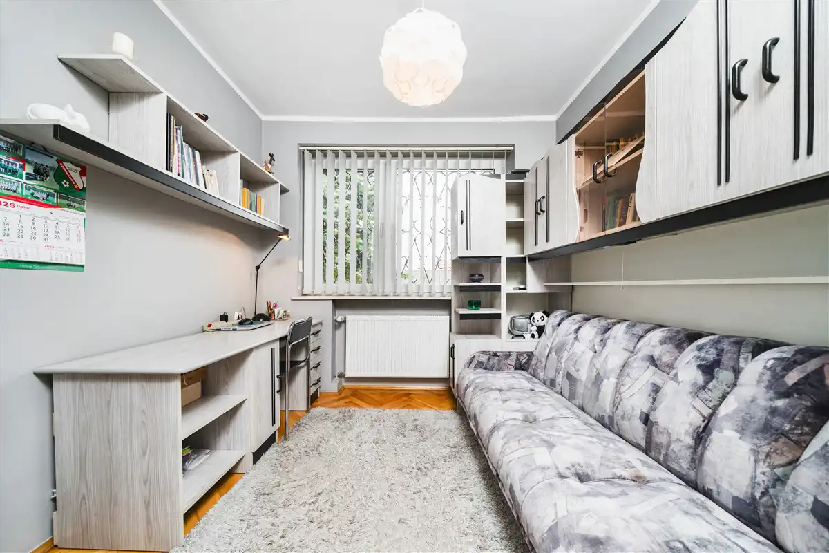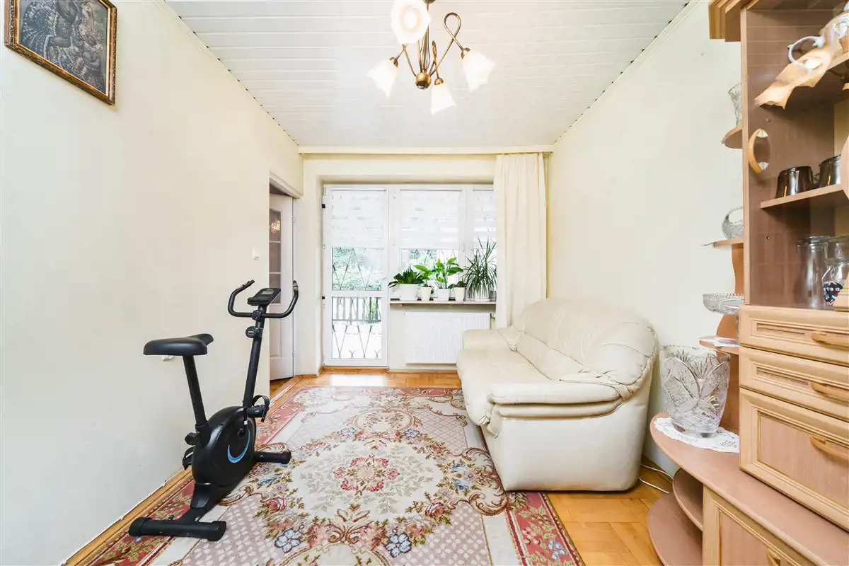 Na podłogach w pokojach parkiet, w pozostałych pomieszczeniach płytki.