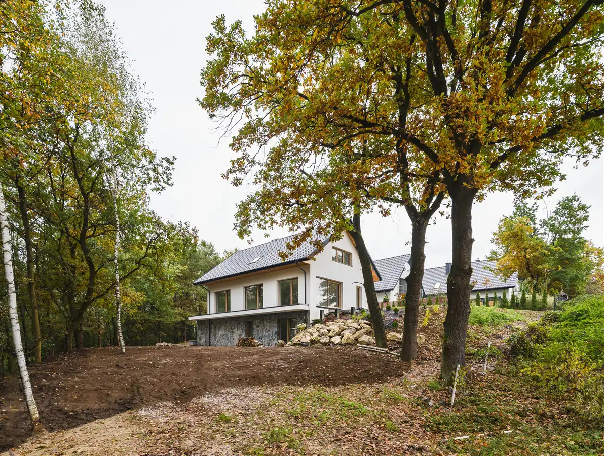 Dom położony jest zaledwie kilka minut od Krakowa oraz lotniska w Balicach, na nieregularnej działce przy lesie, otoczonej trzema wiekowymi dębami, które zapewniają prywatność i wyjątkową atmosferę. To miejsce tworzy ide