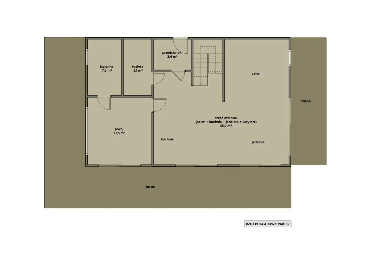 - Imponujący salon z kominkiem, połączony z otwartą kuchnią i jadalnią