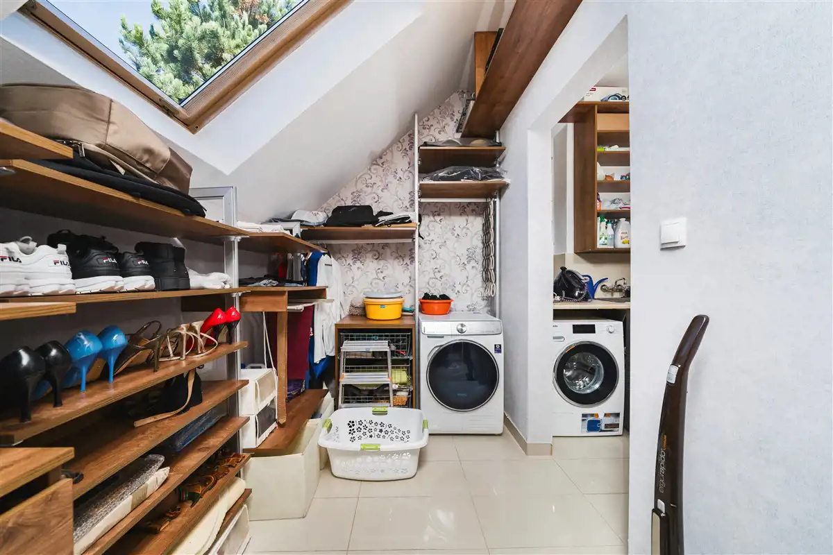 Z parteru jest wyjście do garażu oraz pomieszczenia gospodarczego, gdzie znajduje się pompa ciepła firmy Daikin. W domu oprócz instalacji wodno-kanalizacyjnej jest woda ze studni głębinowej wraz z całą instalacją.