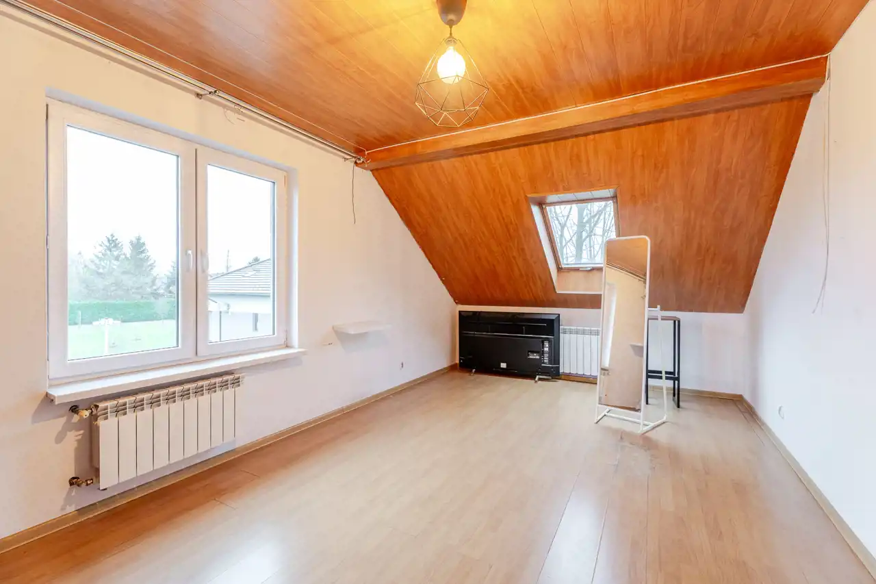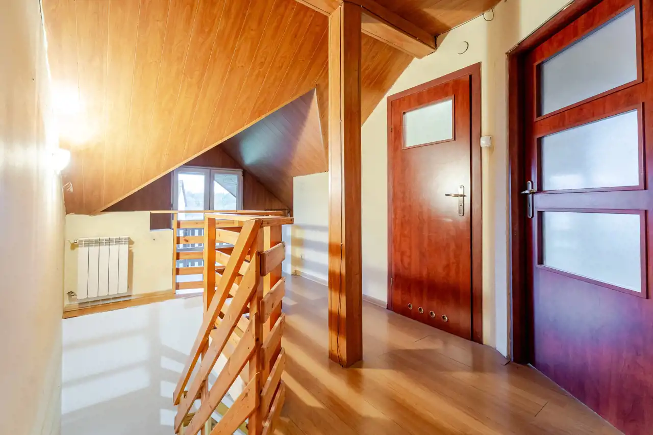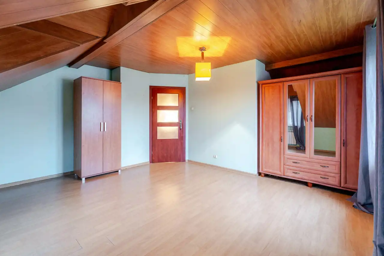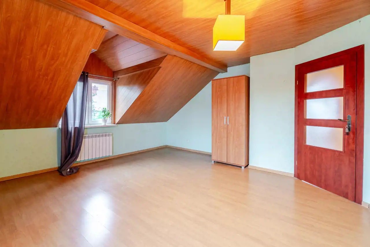 Piętro domu składa się dwóch pokoi, każdy ok. 20 m2, garderoby 3 m2, łazienki ok. 3 m2 oraz przedpokoju z wyjściem na balkon.