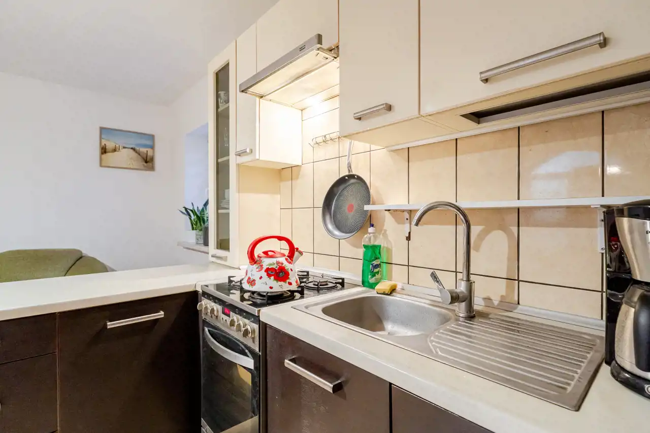 Gotowanie w kuchni odbywa się w piekarniku elektrycznym oraz na płycie gazowej ( podłączenie zewnętrzne do butli z gazem).