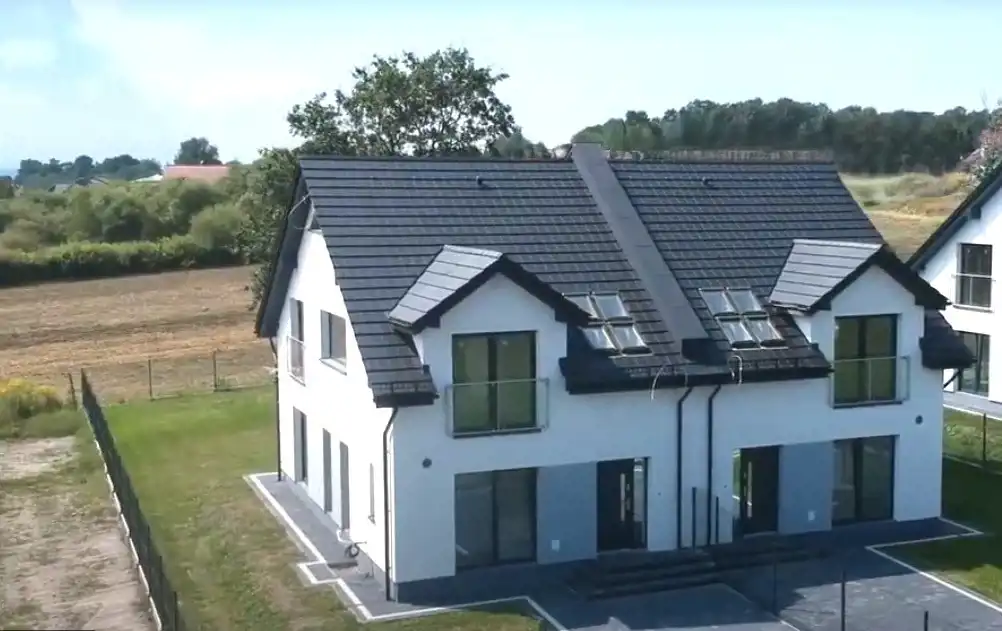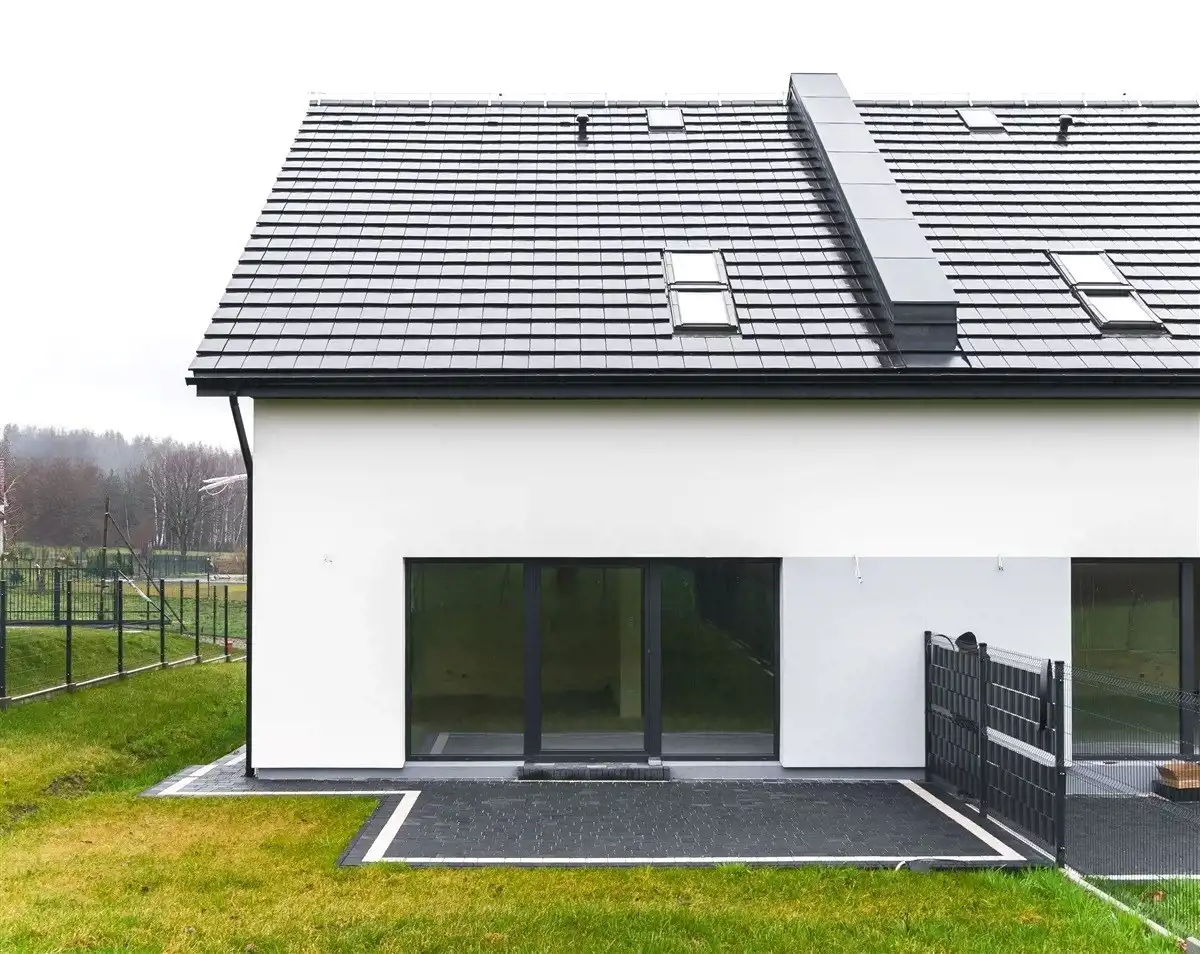 Rekuperacja i pompa ciepła w tym budynku to standard. Dom posadowiony na ustawnej działce.