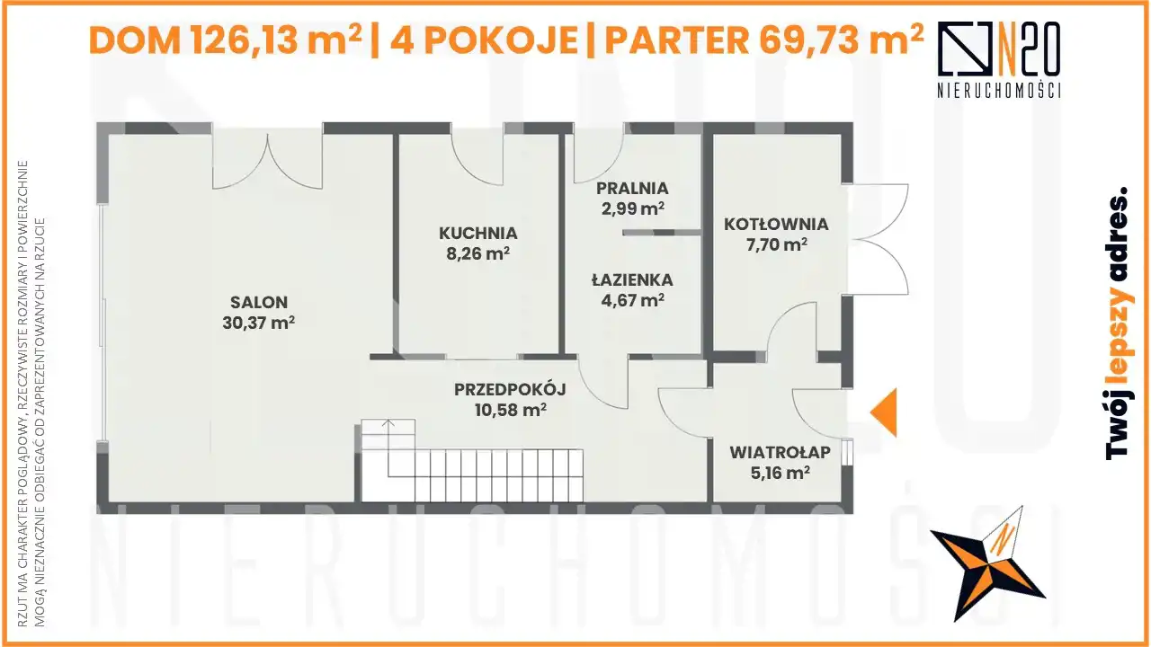 Parter: - Salon z kuchnią i jadalną z wyjściem na taras, wiatrołap, przedpokój, pralnia, kotłownia, łazienka.
