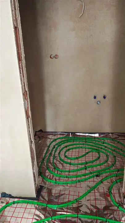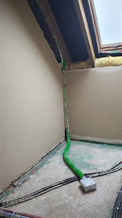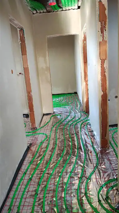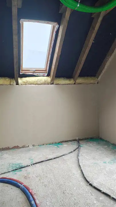 Woda rozprowadzona w budynku, prąd również. Tynki wewnętrzne wykonane, wylewki w trakcie.