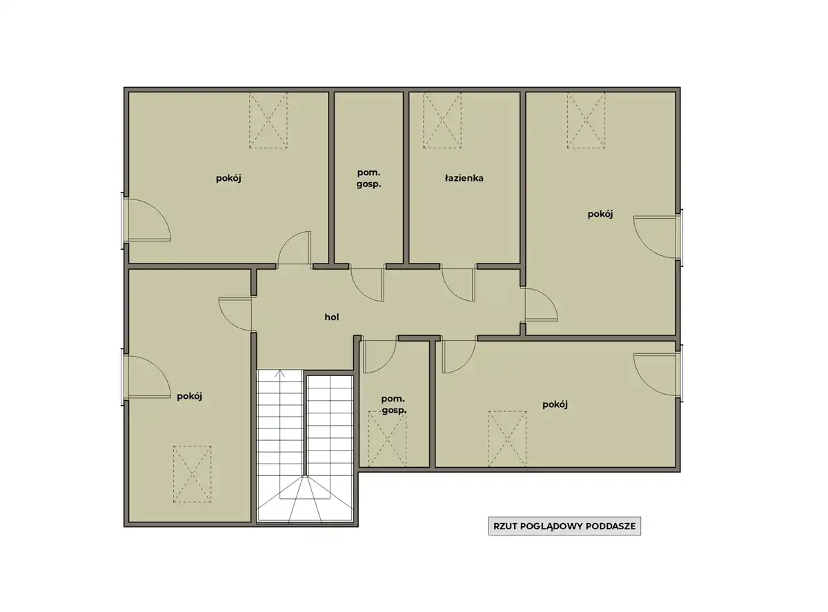 Na poddaszu znajduje się komunikacja, cztery pokoje, garderoba, łazienka i pom. gospodarcze.