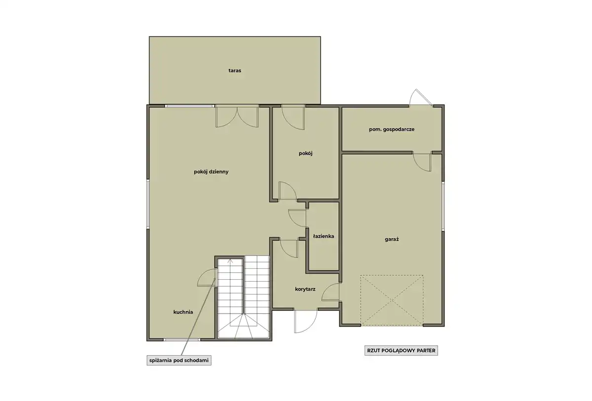 Na parterze znajduje się wiatrołap, salon z jadalnią, spiżarnia, łazienka, kotłownia, garaż, pokój