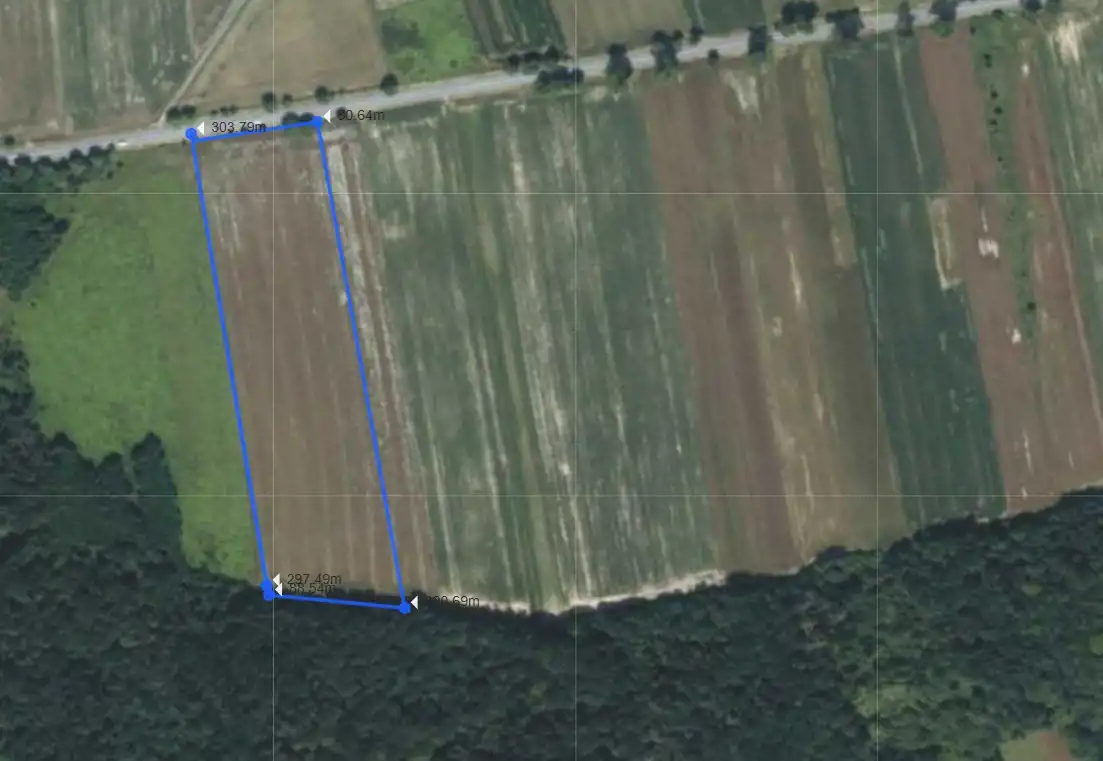 Działka o powierzchni 2 65 ha zbliżona kształtem do prostokąta. Szeroka na ok. 85 metrów, długa na ok. 300 m.