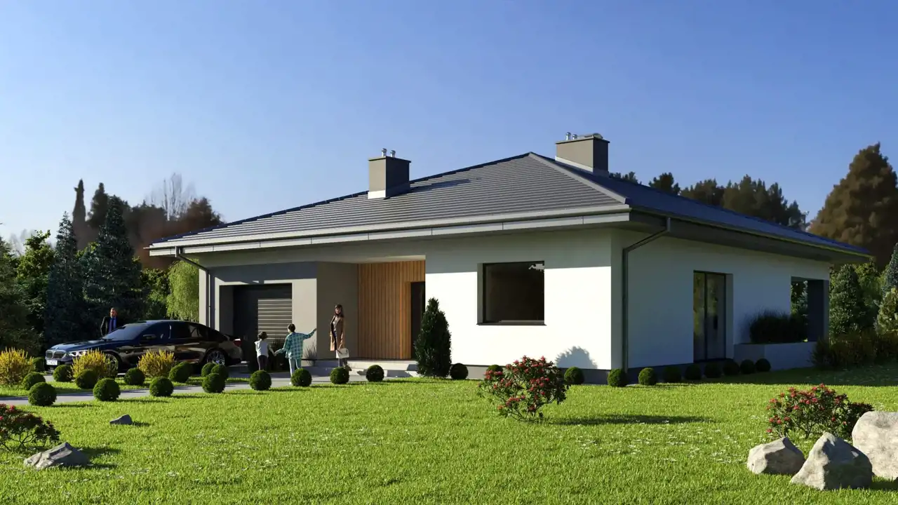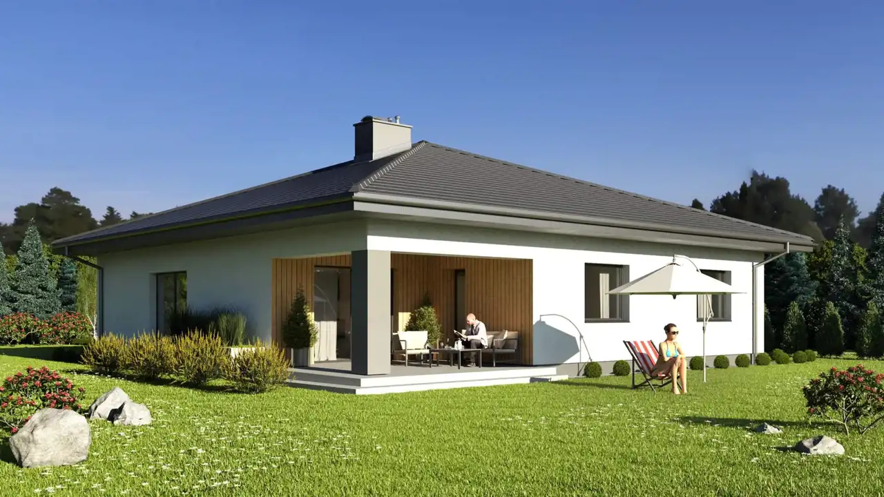 Projekt przedstawia nowoczesną bryłę domu o pow 139,61 mkw z wygodnym rozkładem pomieszczeń.