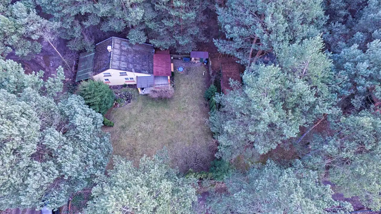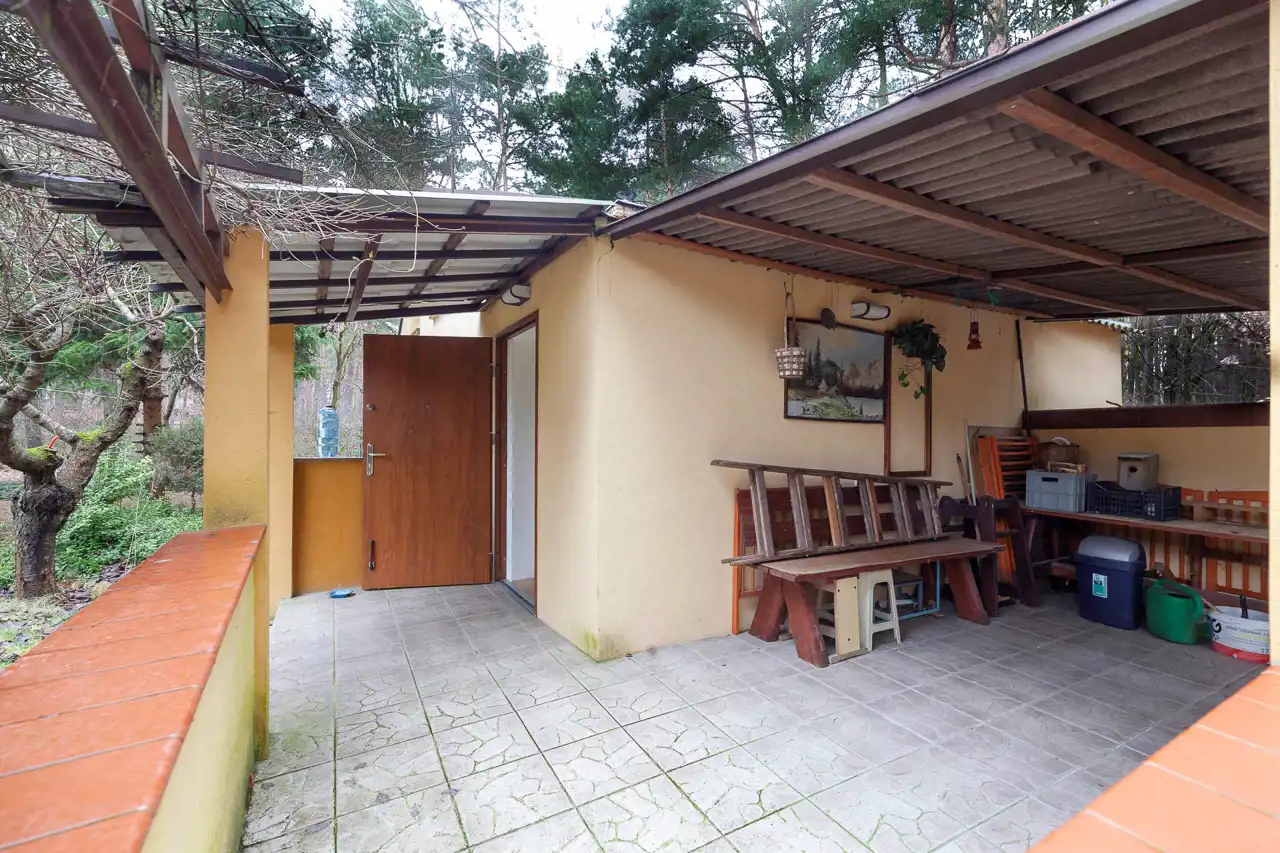 Działka zlokalizowana jest na końcu terenów działkowych w otulinie licznych drzew iglastych.