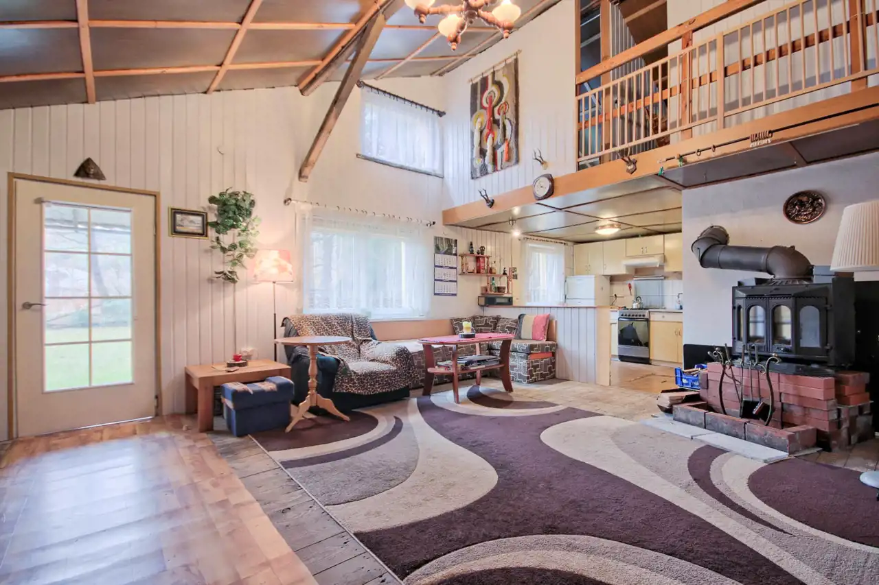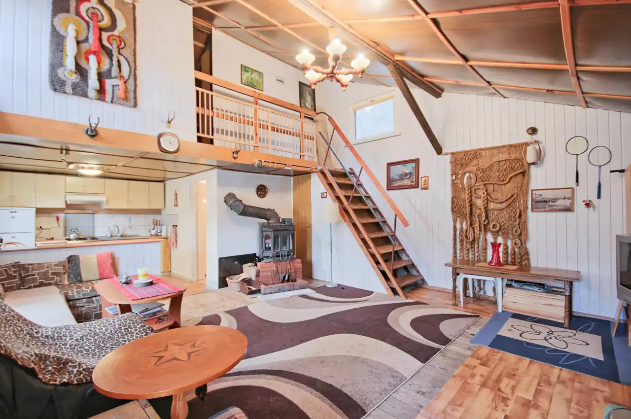 Wewnątrz budynku zamontowany jest kominek.