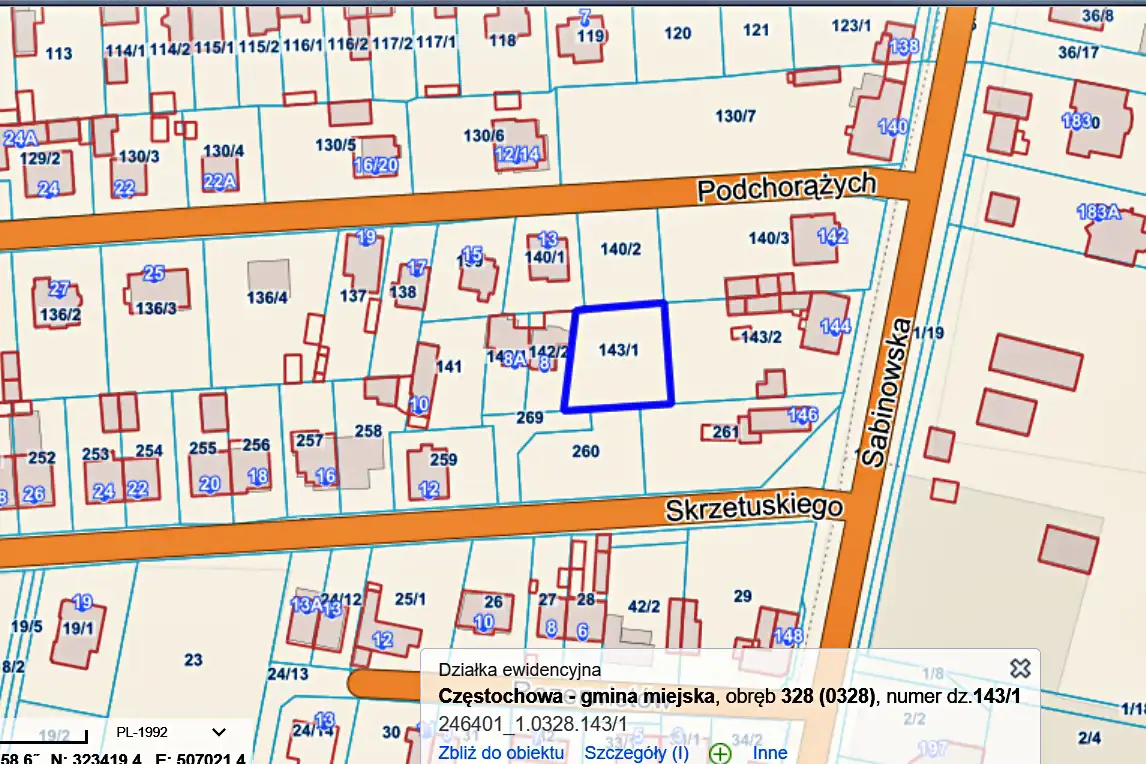 Działka o numerze ewidencyjnym 143/1 (obręb 328 ) zlokalizowana jest przy ulicy Skrzetuskiego .
