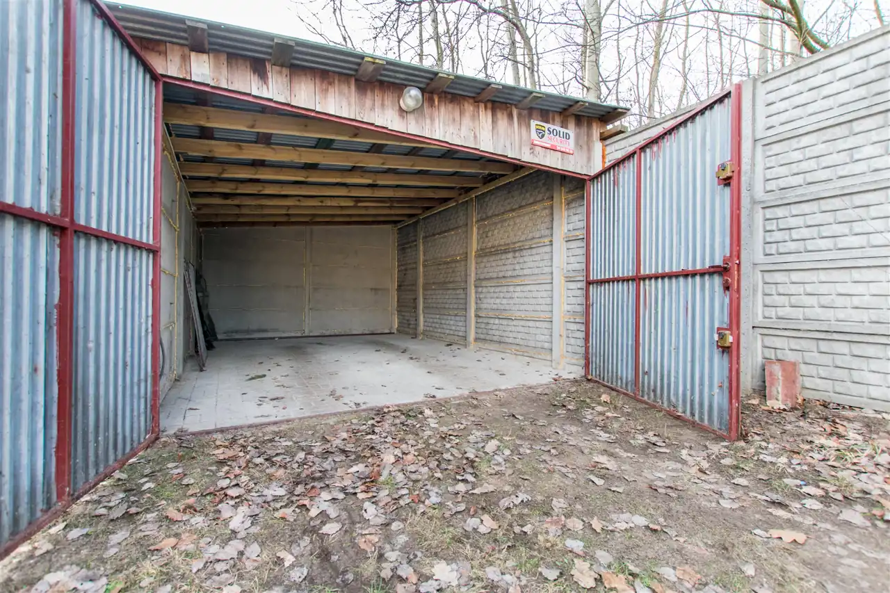 Wylewka na podłodze lub podłoże z kostki brukowej. Garaże zadaszone i orynnowane, posiadają dostęp do energii elektrycznej. Dach w konstrukcji drewnianej, kryty blachą.