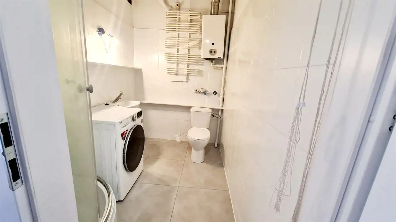 - łazienka z prysznicem i pralką