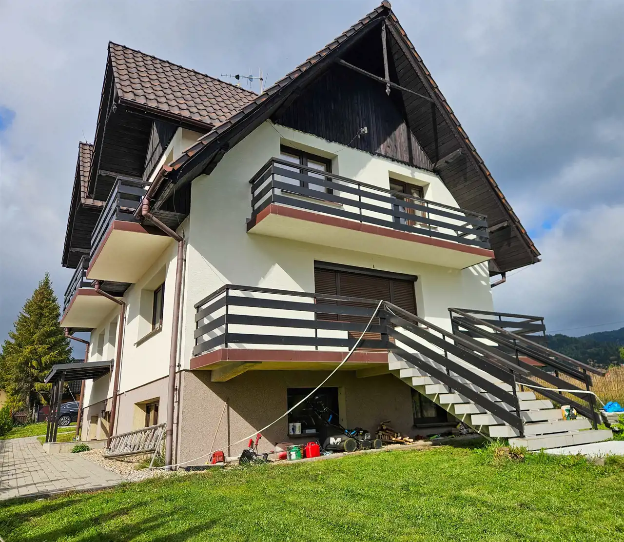 Oferowana nieruchomość łączy budynek jest domem całorocznym z możliwością wynajmu dużego niezależnego apartamentu z odrębnym wejściem.