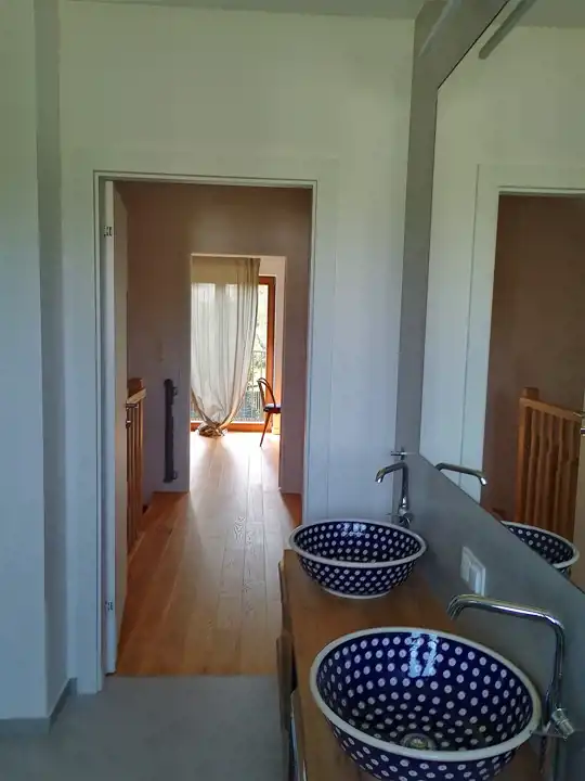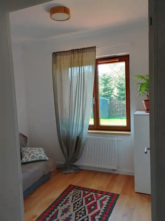 Urządzony w minimalistycznym, neutralnym stylu, biale ściany i zabudowa, drewniana podłoga i schody , szary gres. Wodny, energooszczedny. Dom w bardzo spokojnej okolicy w otulinie Kampinosu. W pobliżu stajnie , ścieżki rowerowe. Bardzo dobra infrastruktura : w pobliżu żłobek, szkoły podstawowe, sklepy spożywcze , piekarnia, trasa E7. 5 min pieszo do terenów rekreacyjnych, boiska, plac zabaw. Garaż w bryle. Dostępne wszystkie media : internet światłowodowy, gaz , prąd, kanalizacja, dojazd asfaltem.
