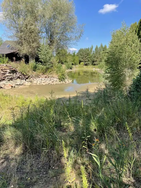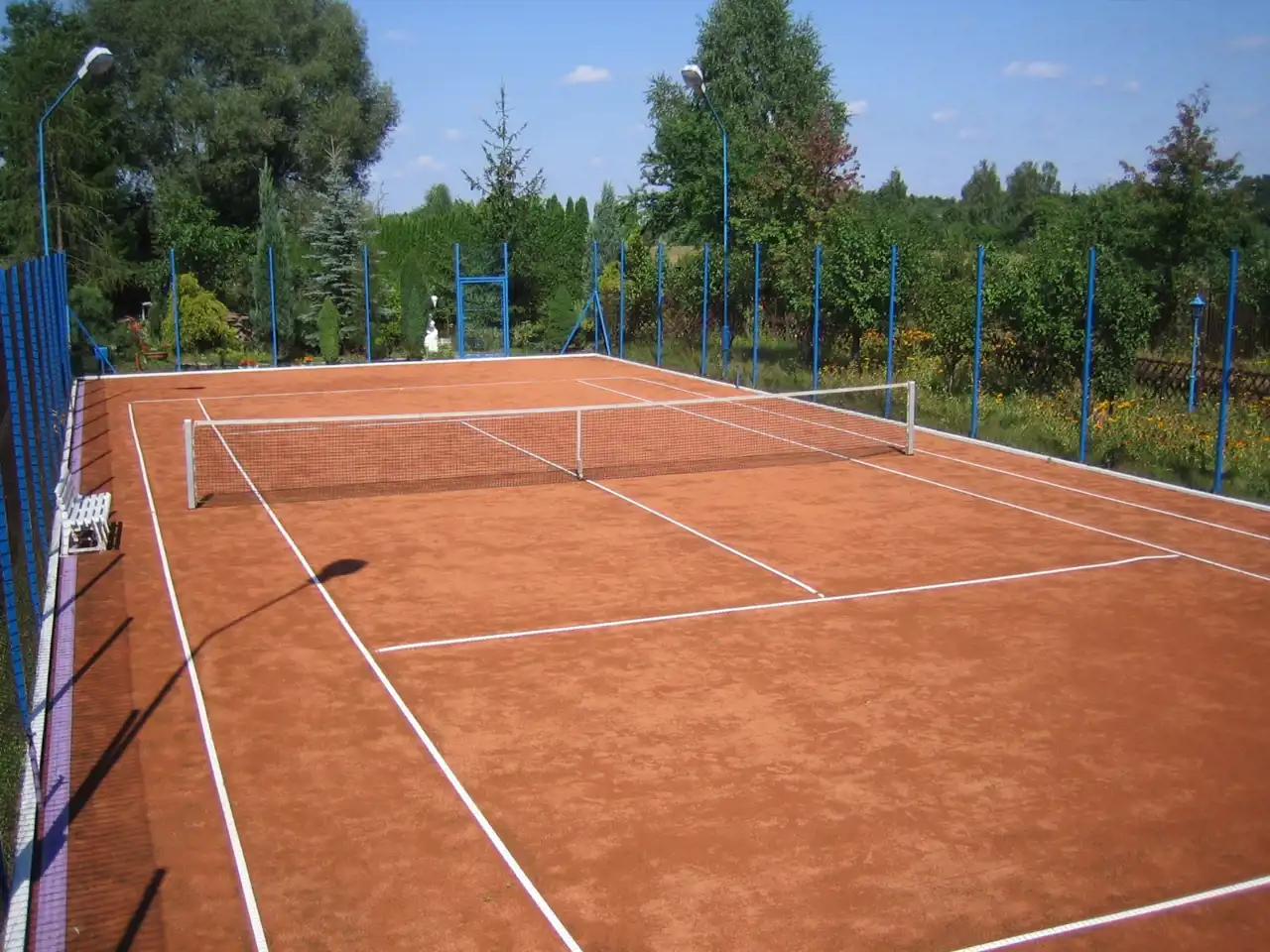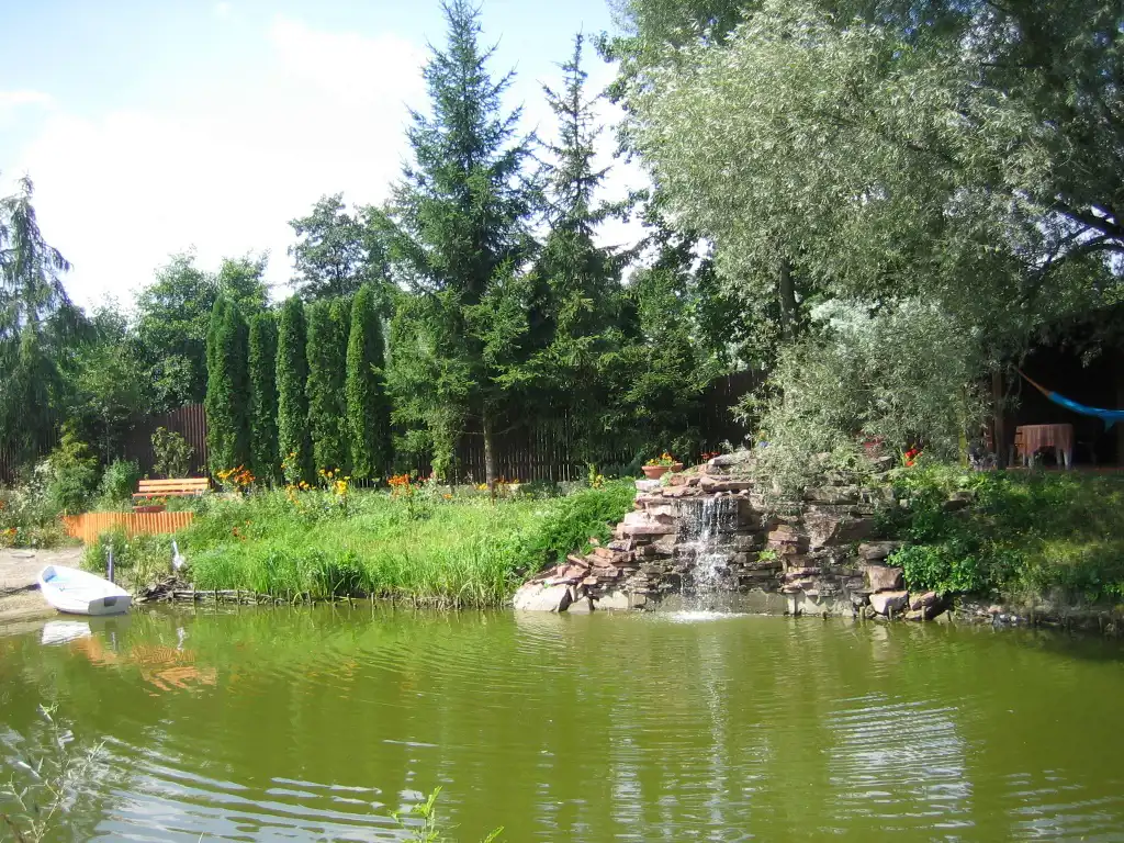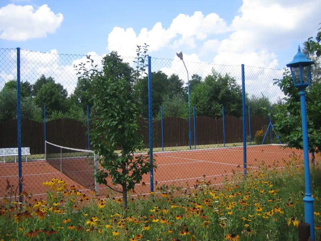Ten obszerny teren o szerokości 27,5m2 ma powierzchnię około 8135m2. Zieleń otacza dom, a drzewa i krzewy tworzą niewielkie kępy w kilku miejscach na działce.Niebywałą atrakcją był zawsze bardzo duży staw, w którym do tej pory mimo bardzo niskiego stanu wody można zauważyć duże ryby (zdjęcia stawu są archiwalne). Tuż przy stawie jest domek rekreacyjny z sauną, łazienką i 2 pomieszczeniami, jednym na parterze i drugim na poddaszu. Do domku doprowadzone są media:sieć energetyczna,wodna i kanalizacyjna ( osadnik ścieków). Między zabudowaniami i stawem jest też miejsce, gdzie był kort tenisowy (zdjęcie kortu są archiwalne). Jeżeli byłaby chęć odtworzenia kortu to można będzie wykorzystać istniejący drenaż i zachowane podłoże.