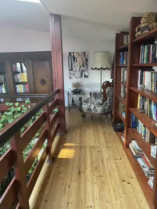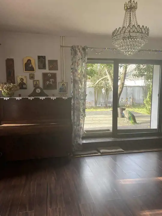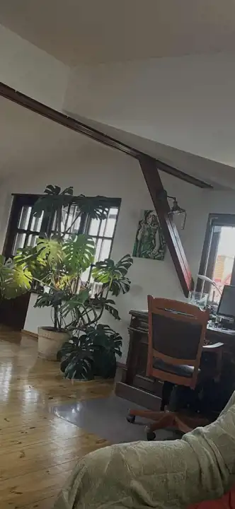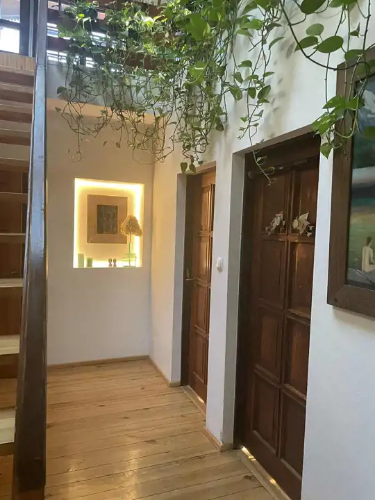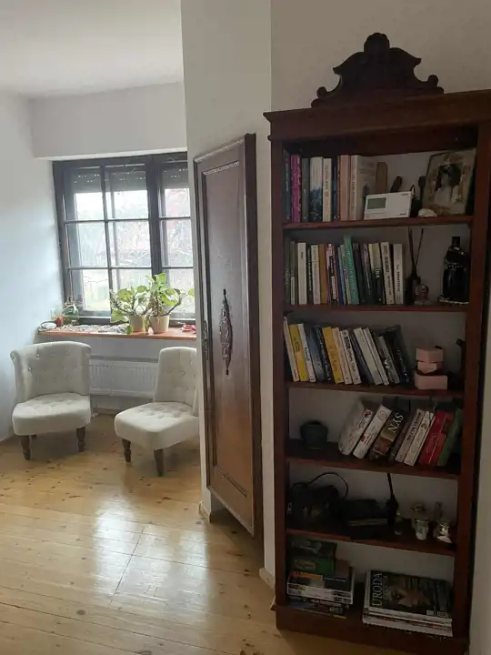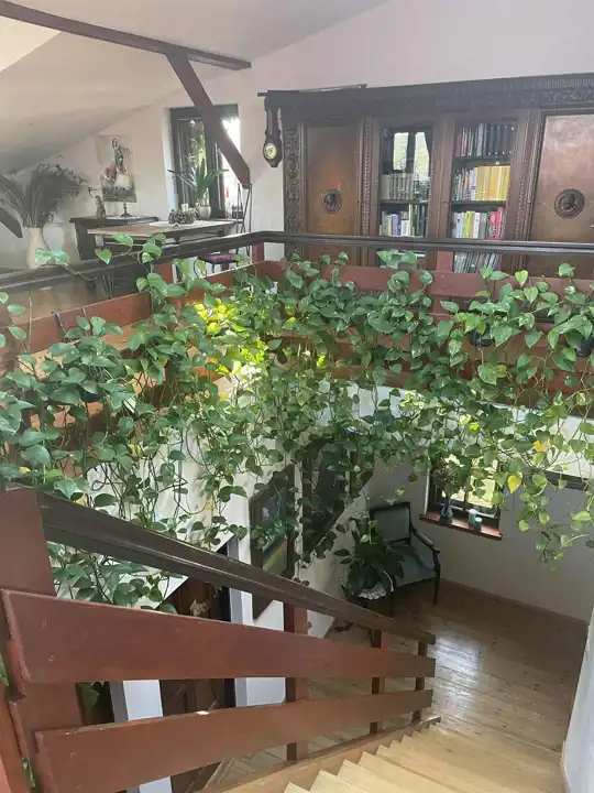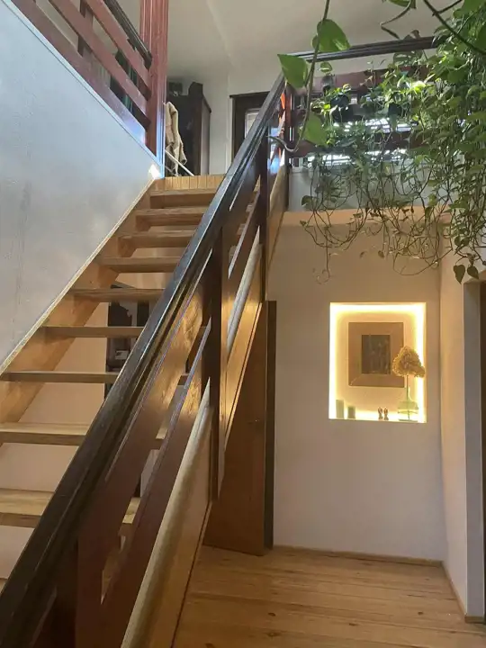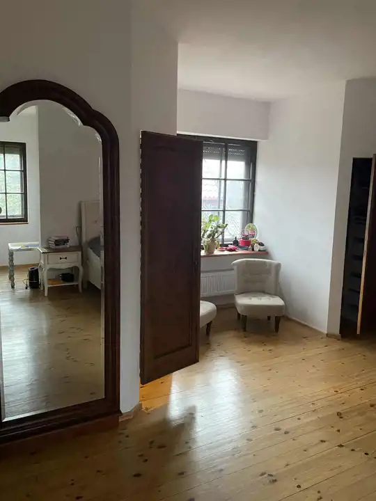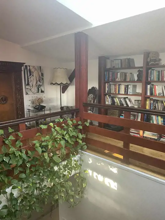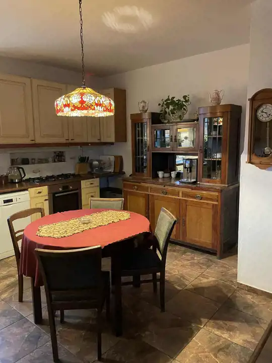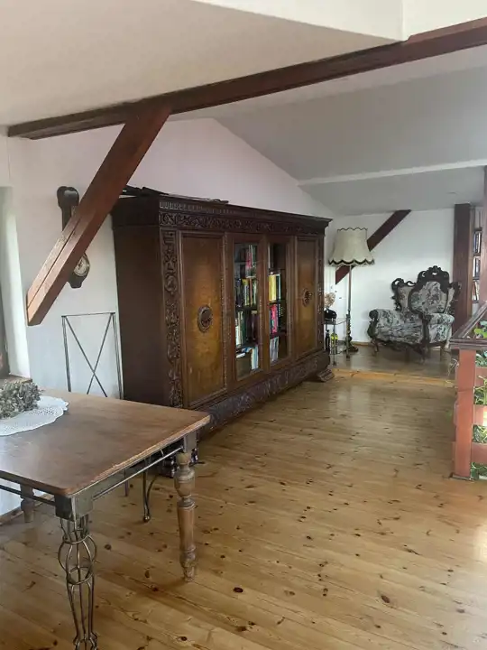 W najstarszej części domu jest przestronna komunikacja, kuchnia z jadalnią o łącznej powierzchni około 32 m2,łazienka 14,3m2 i salon około 42m2 z dużymi oknami (jedno z roletą zewnętrzną), z możliwością wyjścia na 2 tarasy i do ogrodu. Na piętrze są 2 pokoje, każde z wyjściem na loggię,1 sypialnia z wydzieloną garderobą i łazienka, a na poddaszu otwarta, dobrze oświetlona przestrzeń wypoczynkowa i garderoba.