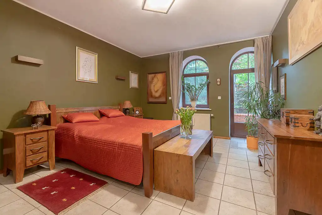 Dom został zaprojektowany w taki sposób, by wyraźnie oddzielić część dzienną od części prywatnej. Dzięki temu strefa wypoczynku i spotkań z rodziną lub gośćmi nie koliduje z prywatną przestrzenią domowników, gdzie znajdują się sypialnie, garderoby i łazienki. Układ pomieszczeń zapewnia zarówno swobodę, jak i intymność. Szczegółowa inwentaryzacja oraz plan budynku dostępne są w biurze lub jako załącznik do ogłoszenia.