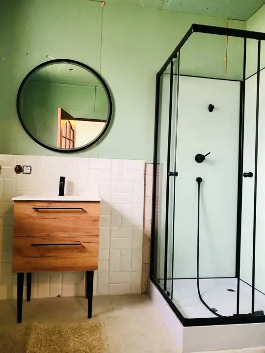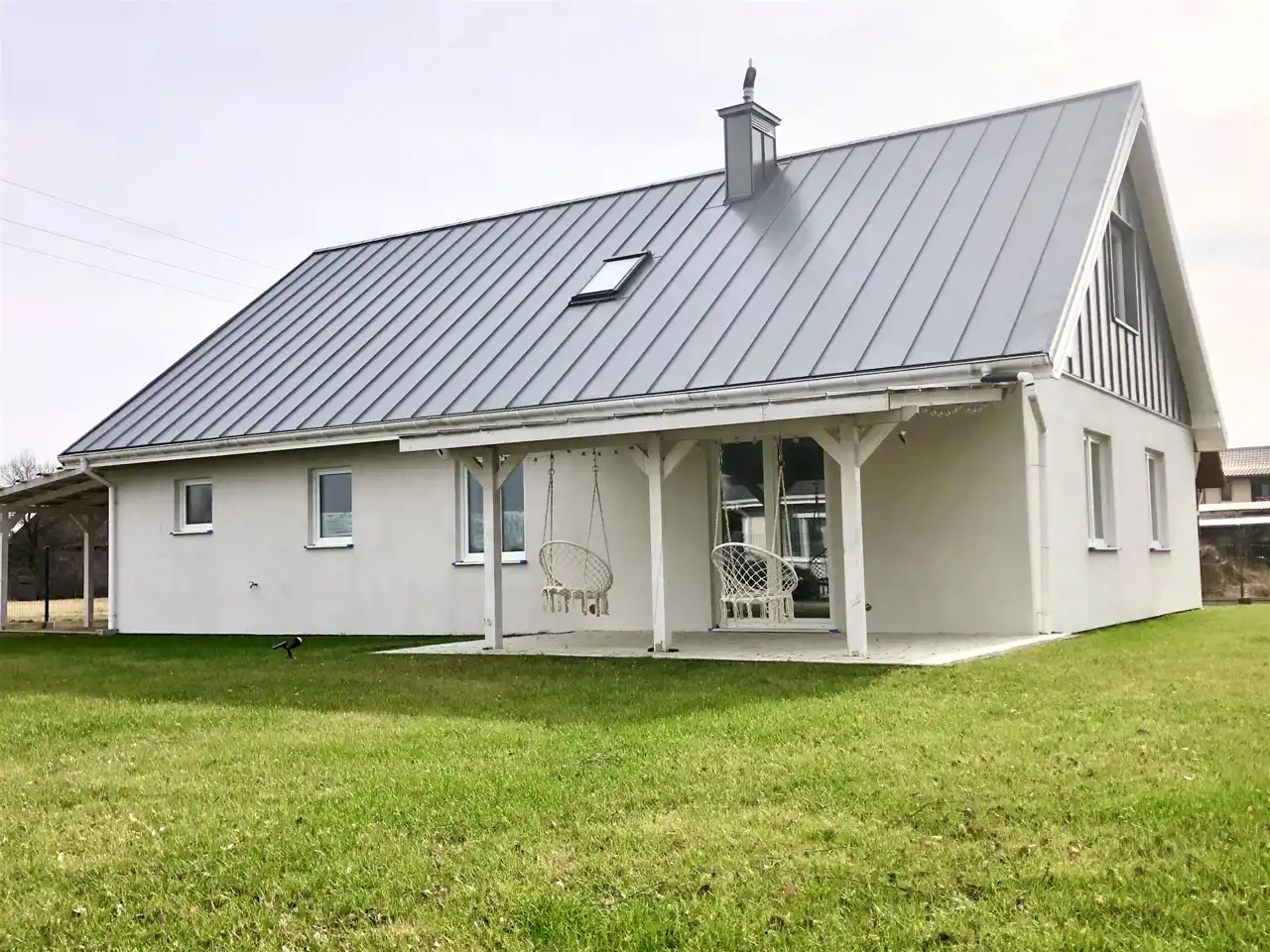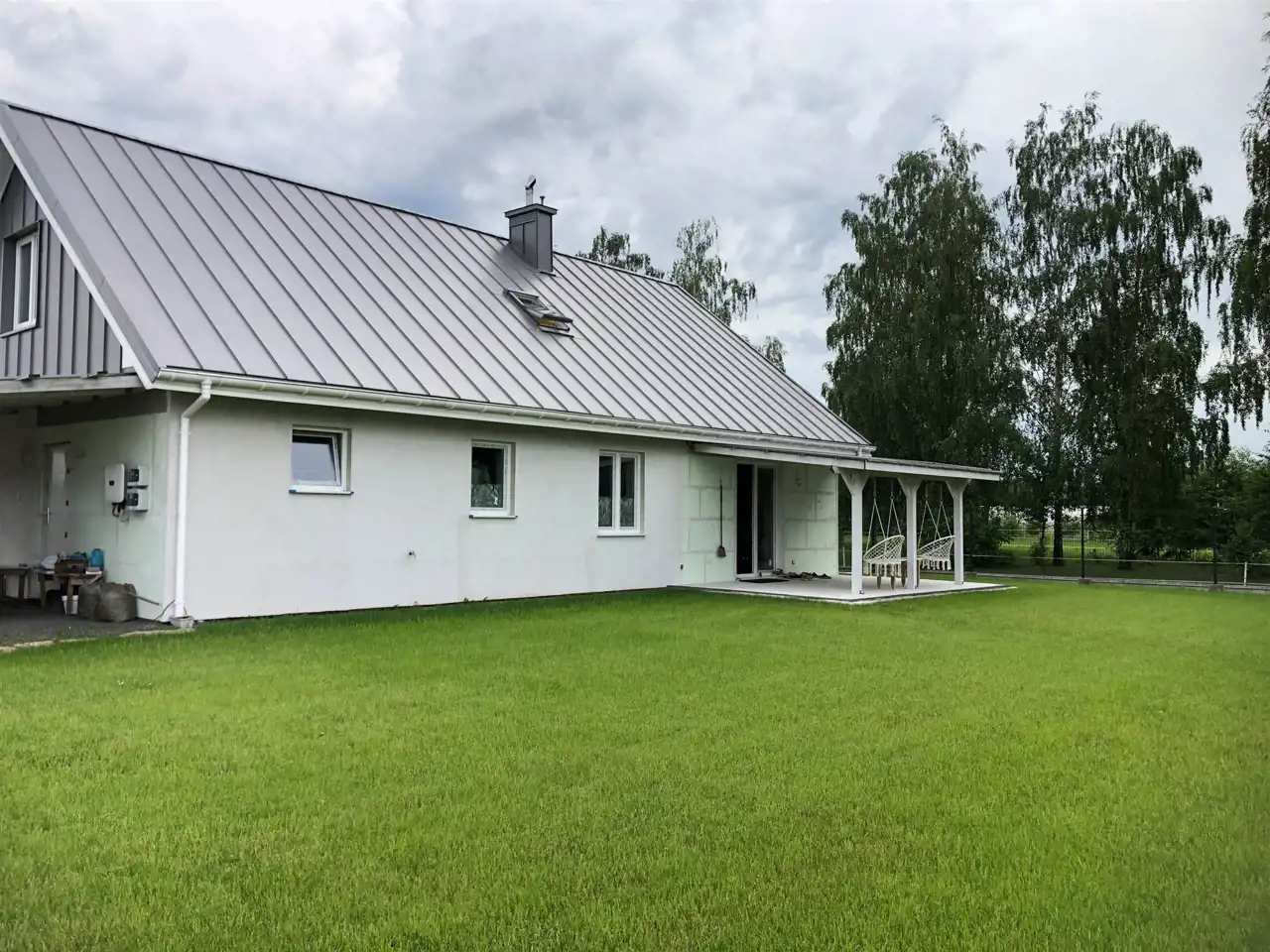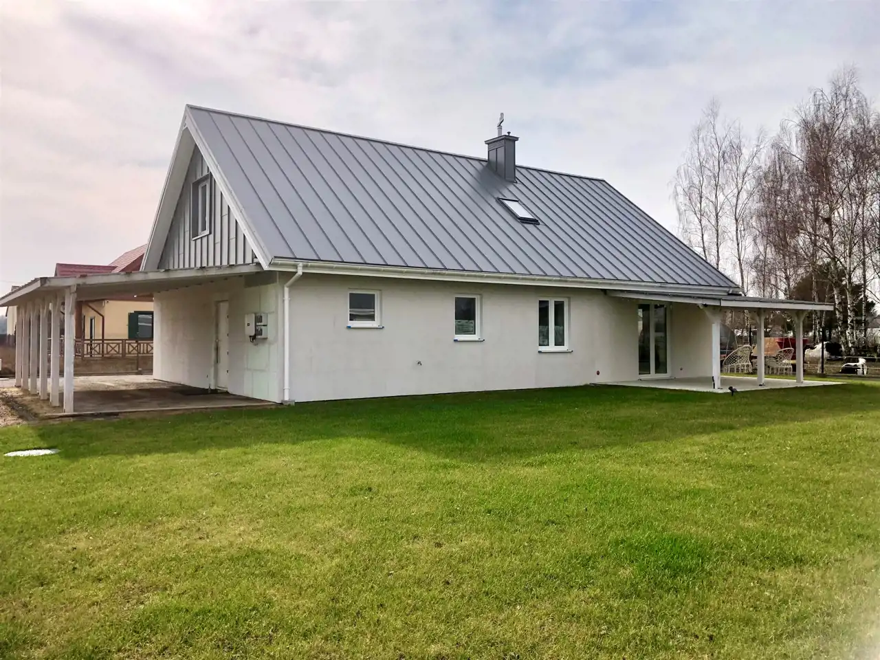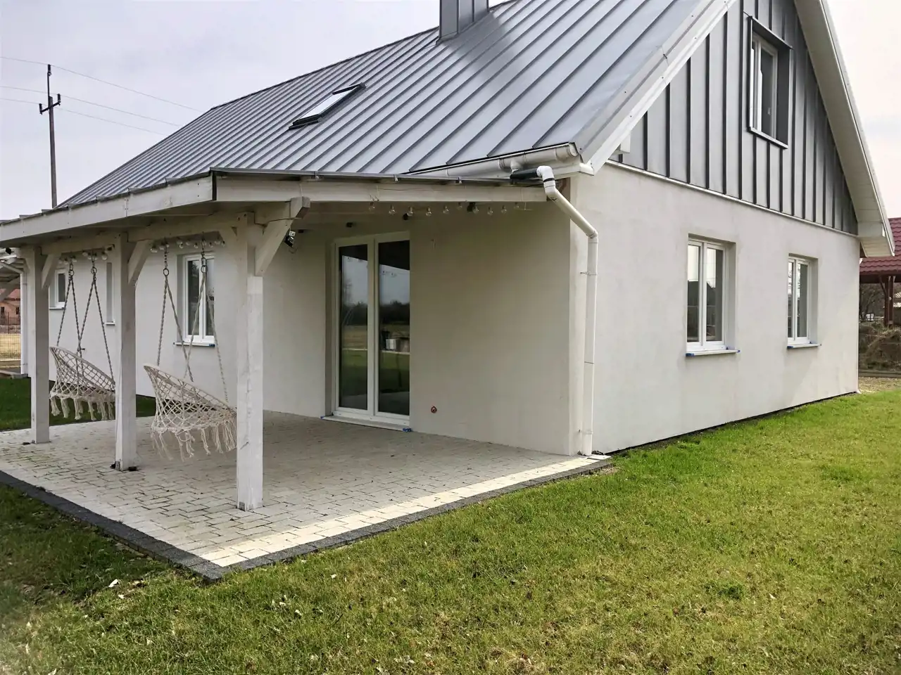 Dom jest wybudowany wg nowoczesnych standardów, z otwartą przestrzenią dzienną (dużym holem,aneksem kuchennym,jadalnią i salonem (z miejscem na kominek),z wydzielonym niewielkim gabinetem,sypialnią 13,5m2,łazienką,a także z oddzielną sypialnią, z własną łazienką i garderobą. Na tym poziomie jest także pomieszczenie gospodarcze (13,2m2),w którym można także wydzielić miejsce na pralnię. Pomieszczenie to posiada także wyjście do ogrodu. Obecnie dom jest w stanie surowym zamkniętym, z zewnątrz całkowicie wykończonym. Harmonogram prac do uzgodnienia z chętnym do zakupu.