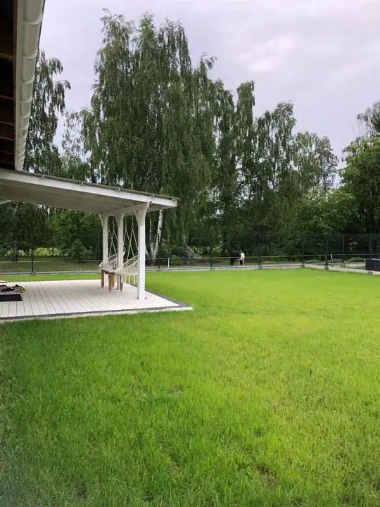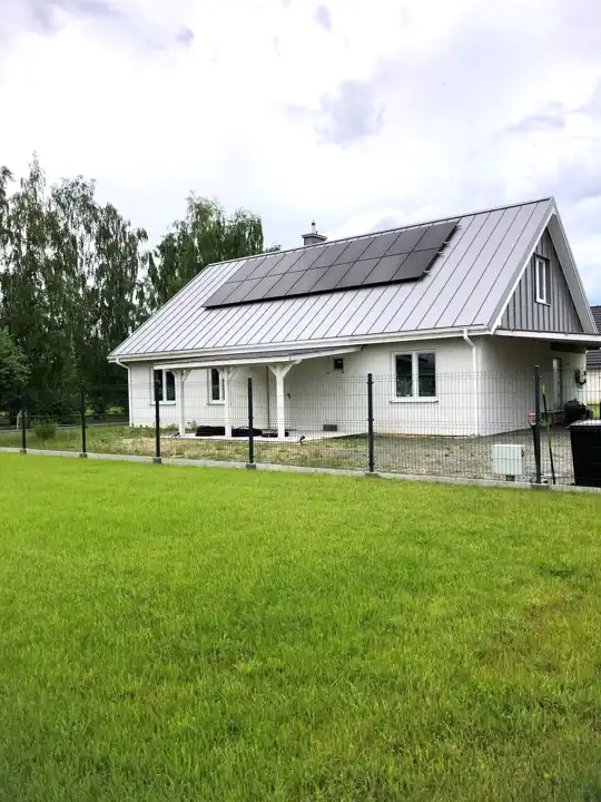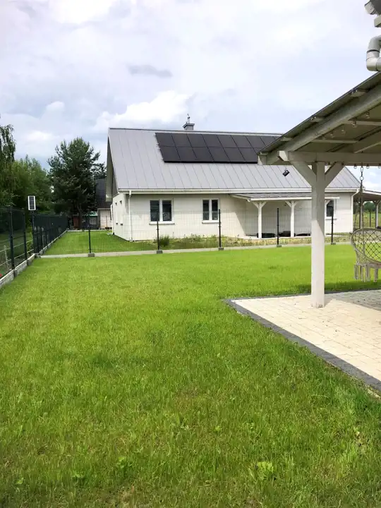 Wejście do domu,taras i miejsce na 2 samochody są zadaszone. Działka jest ogrodzona,podjazd do domu utwardzony,taras wyłożony kostką,a na pozostałym terenie jest trawnik.