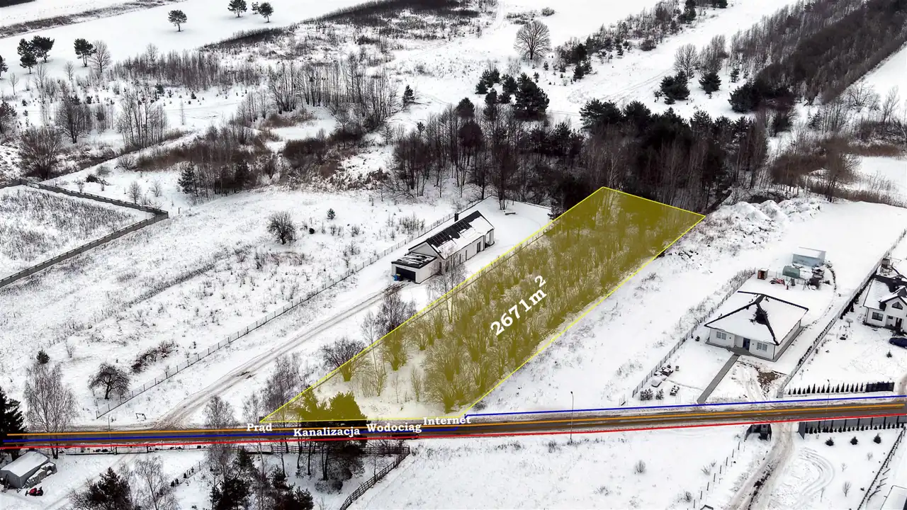 - Media Woda: w drodze; Kanalizacja: w ulicy; Prąd: w ulicy; Gaz: brak