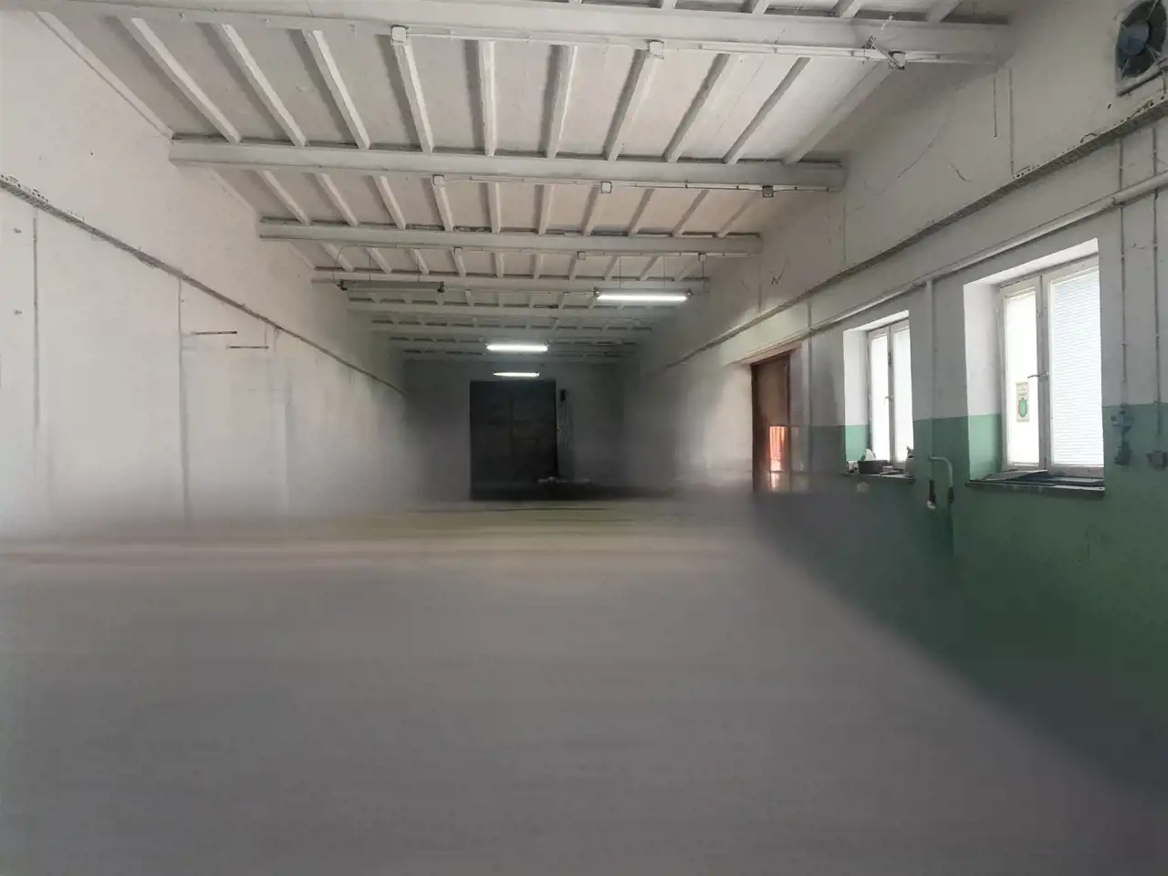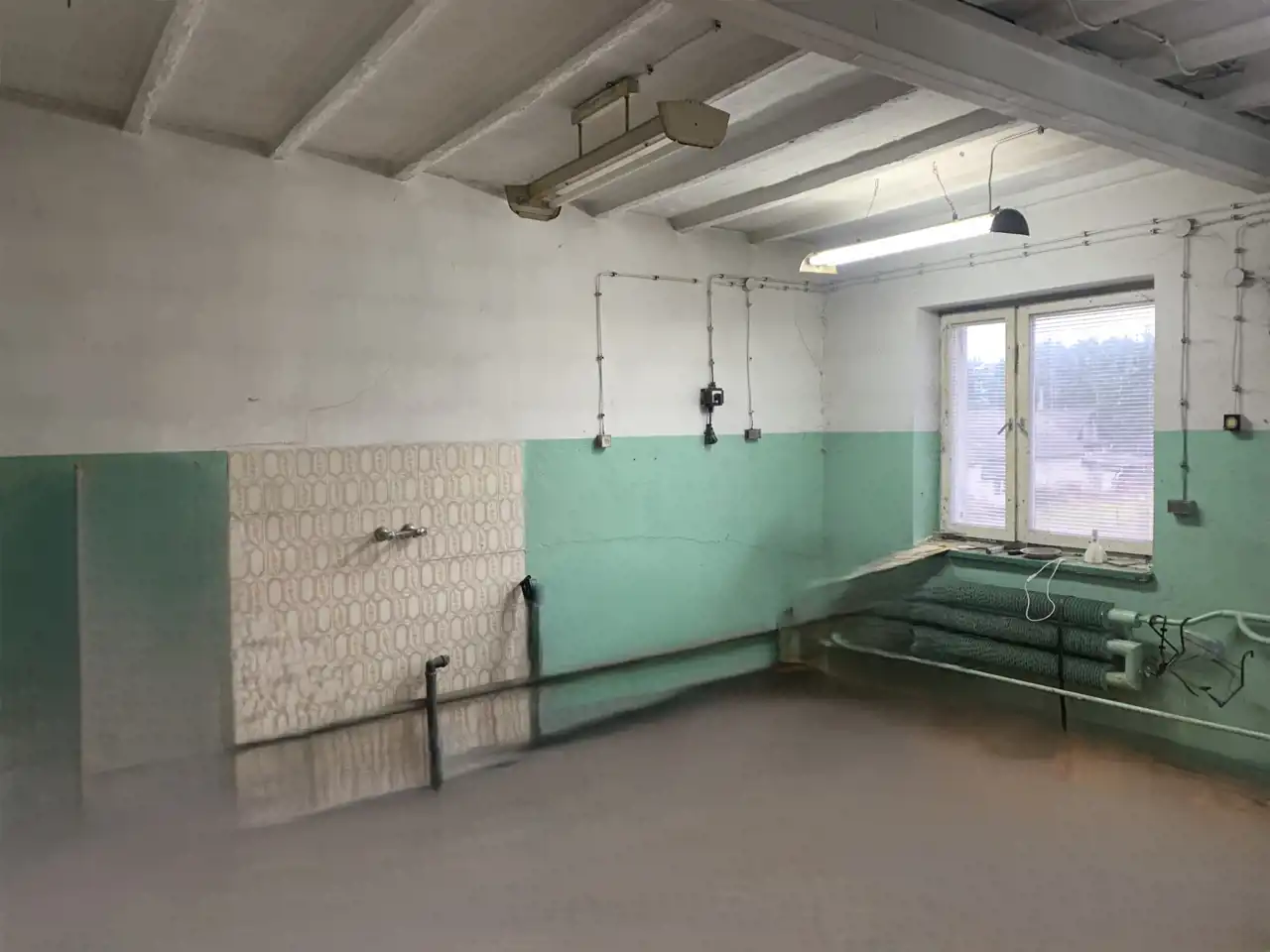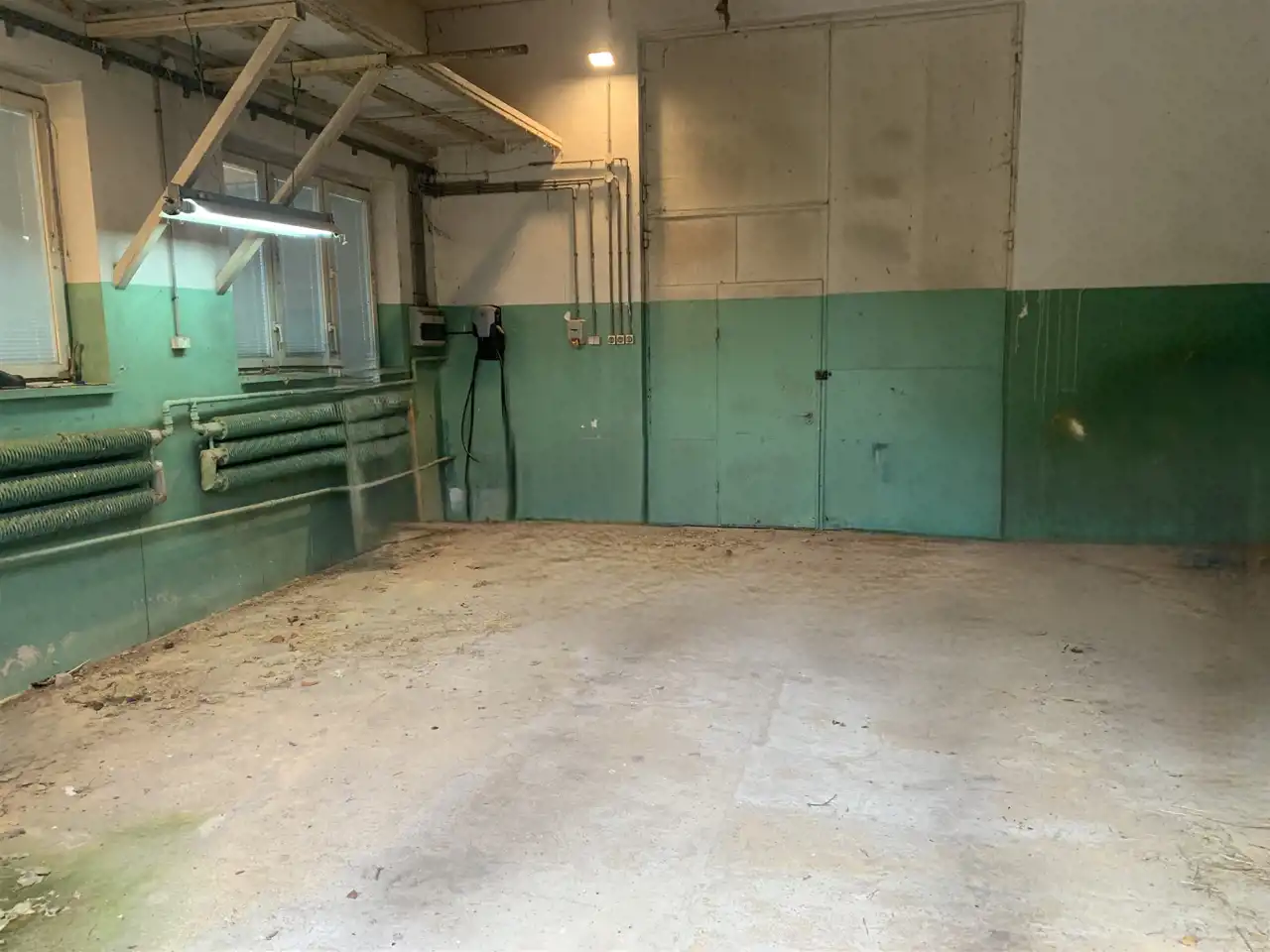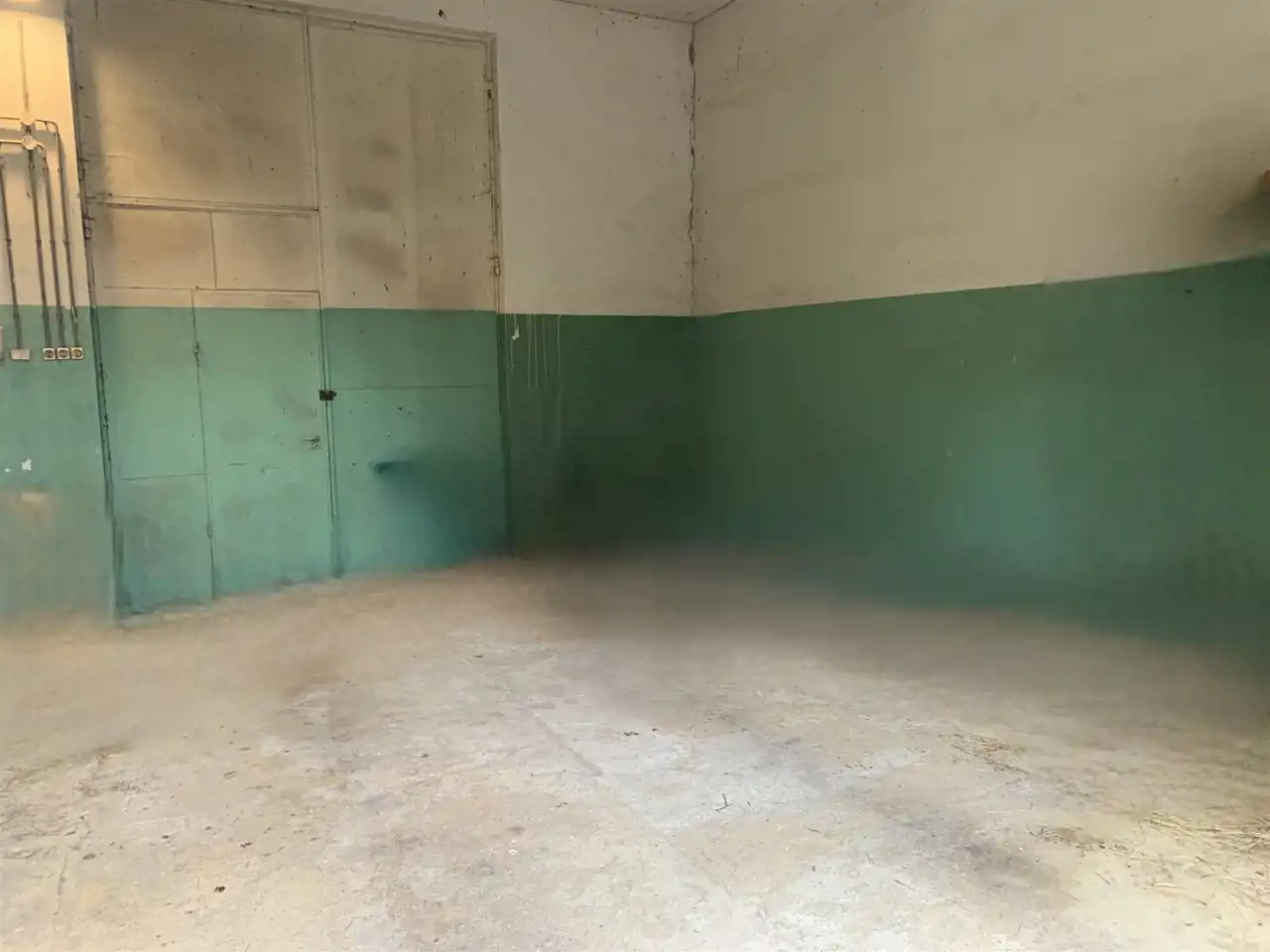 Trzecie pomieszczenie ma wymiary 5,75m x 6,5m i jest w nim wejście schodami na piętro do części biurowej budynku (posiada także bramę o wymiarach wewnątrz ościeżnicy 2,83m x 2,9m). Z korytarza jest wejście do wszystkich pomieszczeń: 31m2, 24m2 ( to pełniło funkcję pomieszczenia socjalnego- doprowadzona woda i kanalizacja) i 13,5m2, a także do łazienki 3,1m2 i 2 toalet.